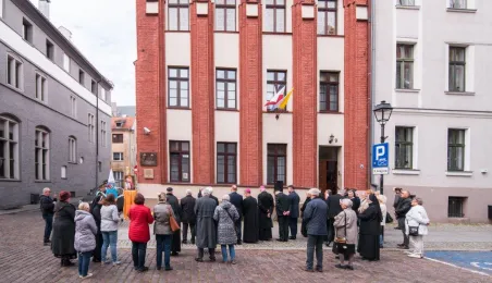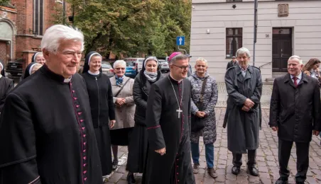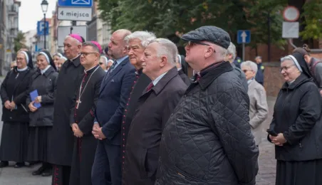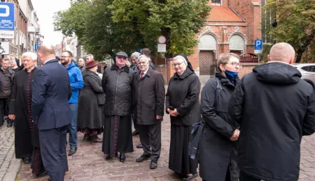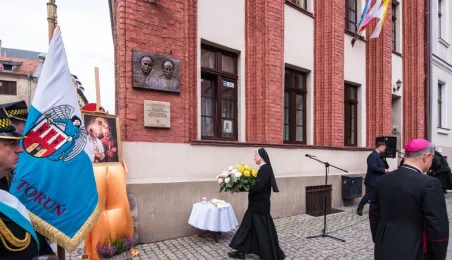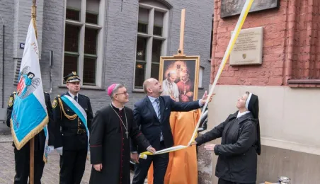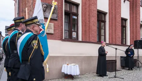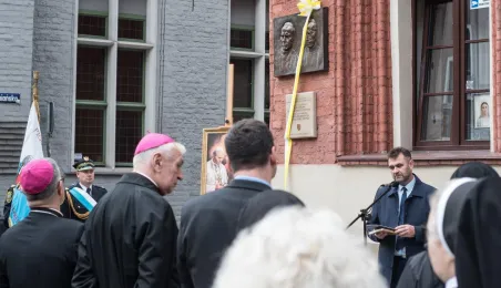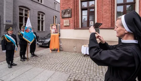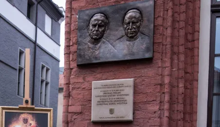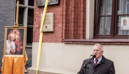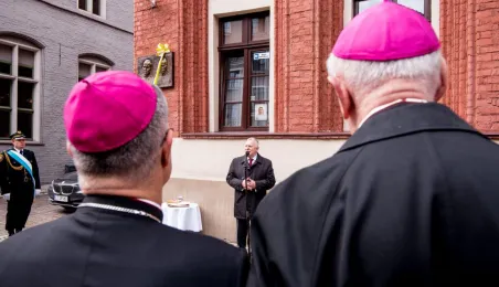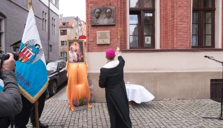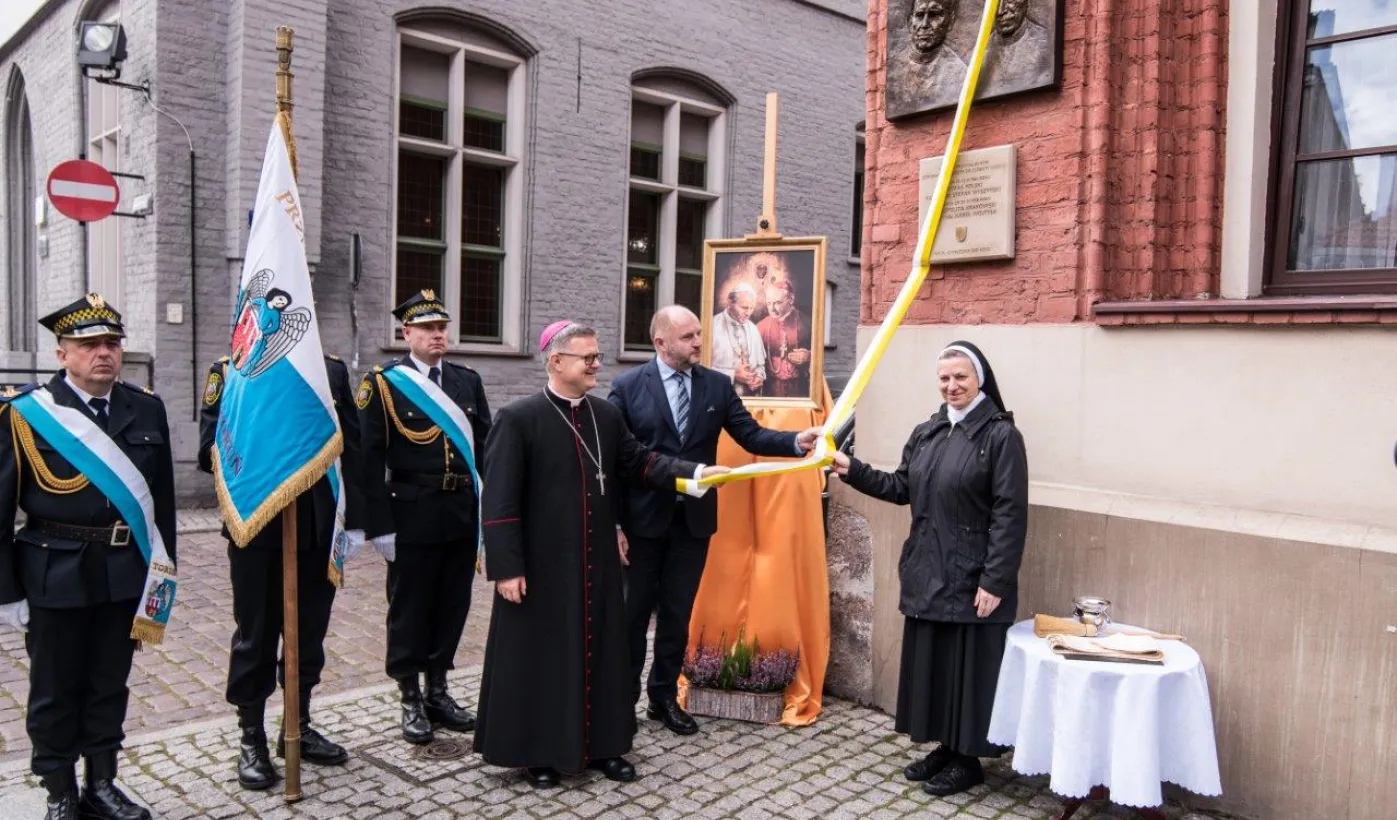 Na fasadzie kamienicy przy ul. Żeglarskiej w dniu 30 września 2021 r. odsłonięto tablicę pamiątkową poświęconą św. Janowi Pawłowi II oraz bł. kard. Stefanowi Wyszyńskiemu. Obaj hierarchowie kościelni przebywali w tym budynku w latach 60. Fot. Lech Kamiński