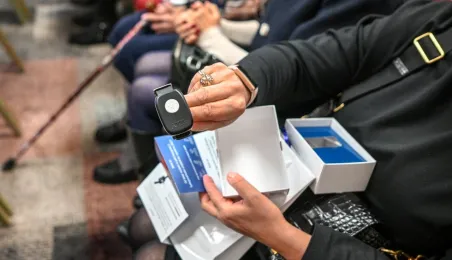 150 toruńskich seniorów otrzymało 8 grudnia 2022 r. specjalne opaski monitorujące ich stan zdrowia i umożliwiające szybki kontakt z odpowiednimi służbami. Toruń jest jedną z 88 gmin, które przystąpiły do specjalnego programu teleopieki domowej, zainicjowanego przez Regionalny Ośrodek Polityki Społecznej w Toruniu. Fot. Lech Kamiński