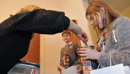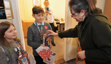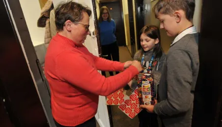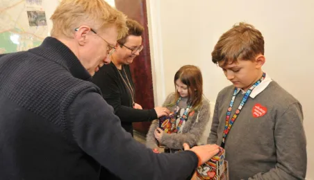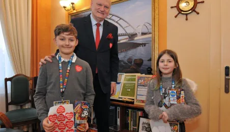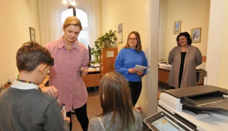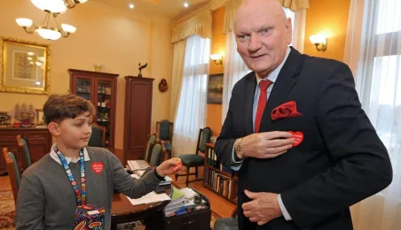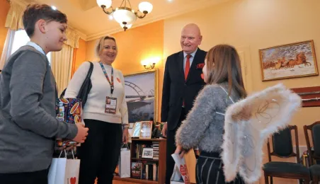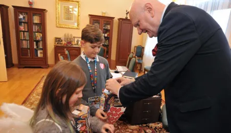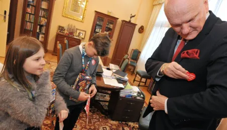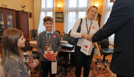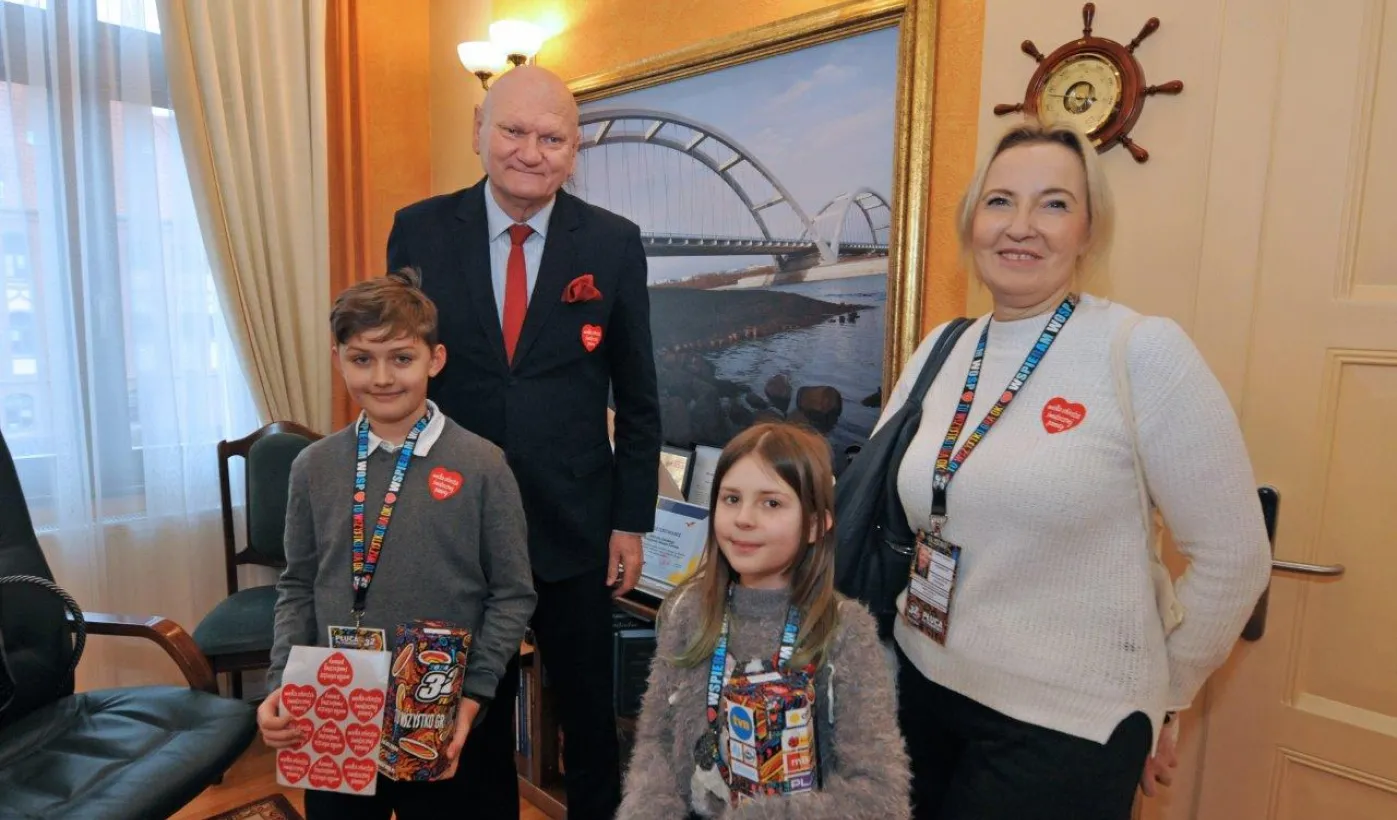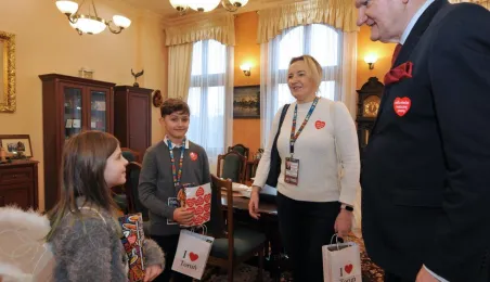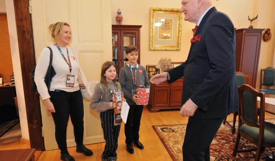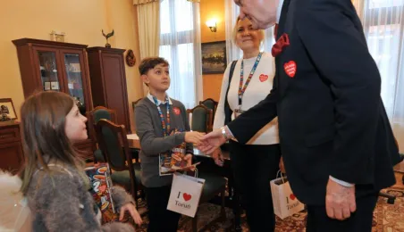Trzy dni przed tegorocznym, niedzielnym finałem WOŚP, który odbędzie się 28 stycznia 2024 r., wolontariusze orkiestry ze Szkoły Podstawowej nr 1 odwiedzili Urząd Miasta Torunia. Pracownicy magistratu, na czele z prezydentem Michałem Zaleskim, jak co roku chętnie zasilili datkami puszki zbiórki na sprzęt do leczenie schorzeń pulmonologicznych u dorosłych i dzieci. Fot. Małgorzata Litwin
