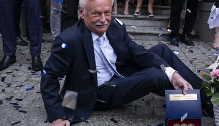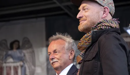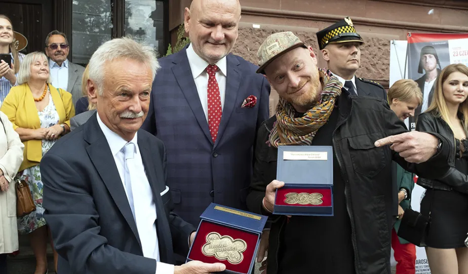 Już 32 mosiężne katarzynki znajdują się w Piernikowej Alei Gwiazd w Toruniu. Dwie najnowsze odsłonili 23 czerwca 2018 r. prezes Toruńskich Zakładów Materiałów Opatrunkowych Jarosław Józefowicz i fotograf Filip Wolak. Galę na Rynku Staromiejskim zakończył koncert Piotra Bukartyka, inaugurujący tegoroczne Koncerty pod Gwiazdami. Fot. Wojtek Szabelski