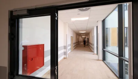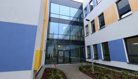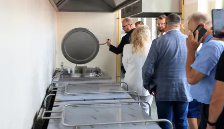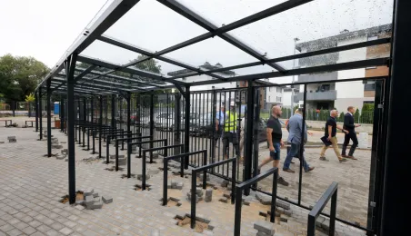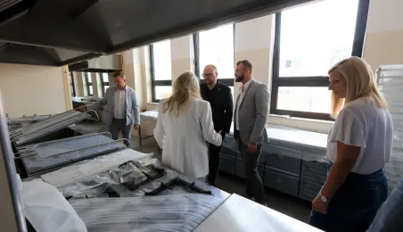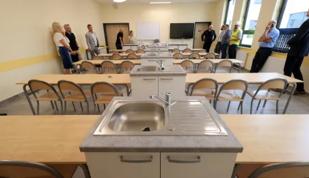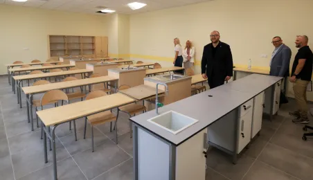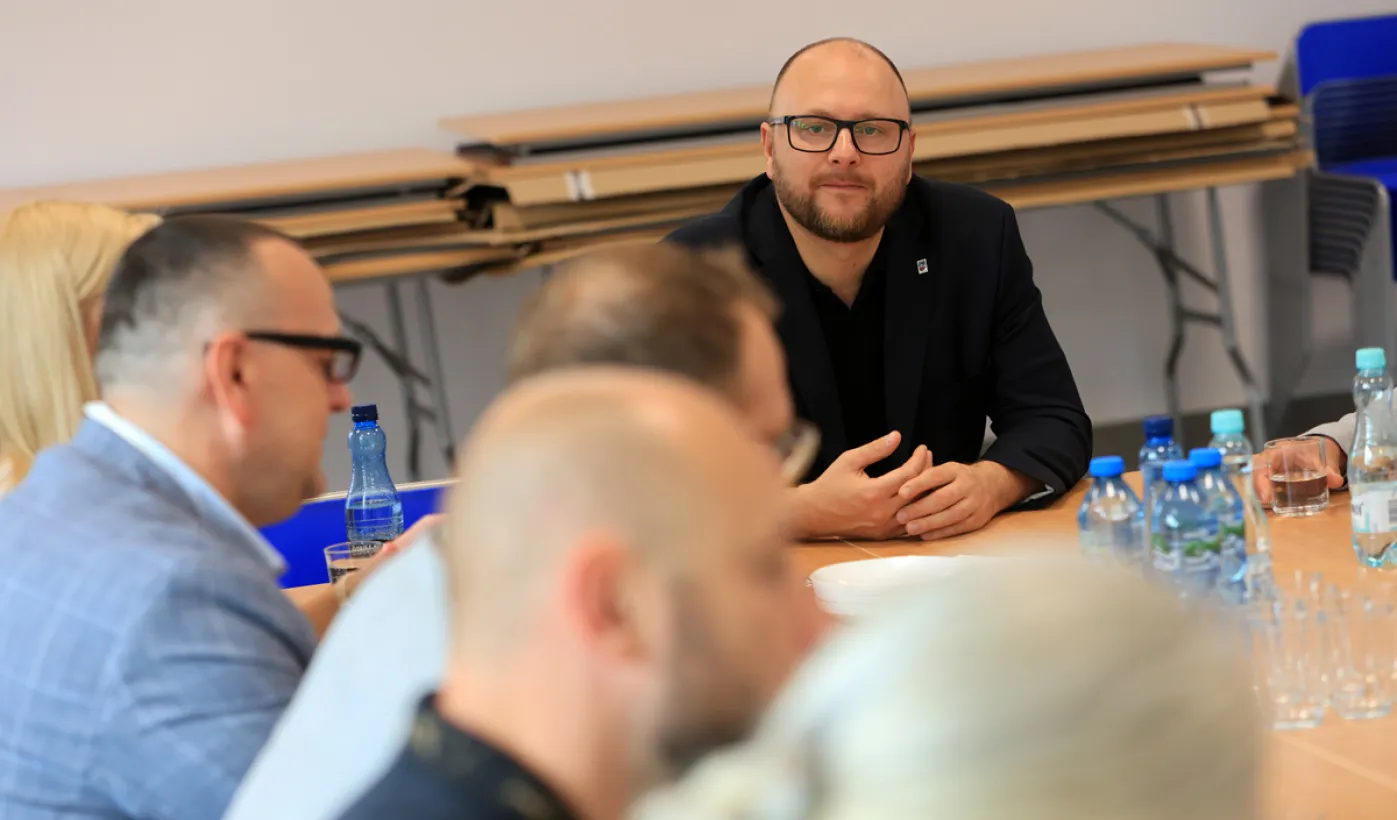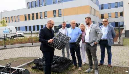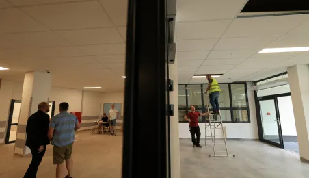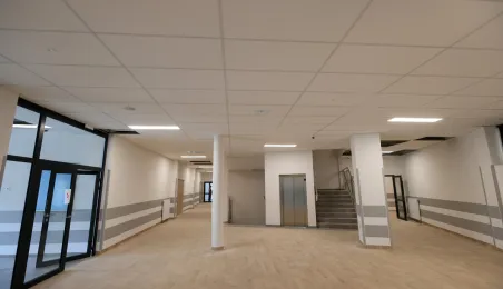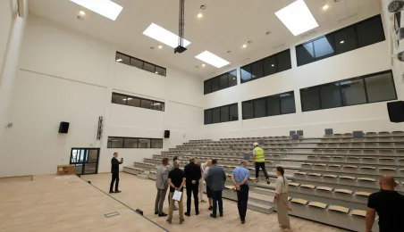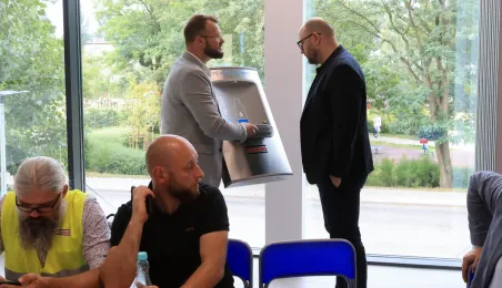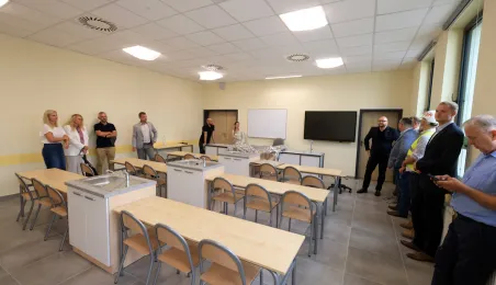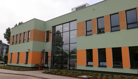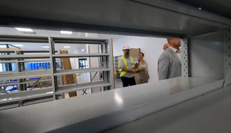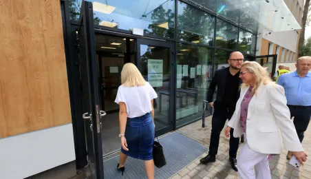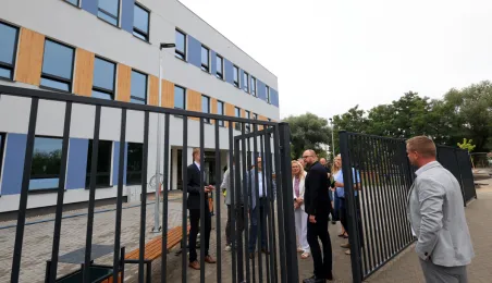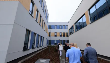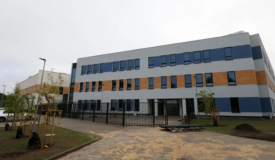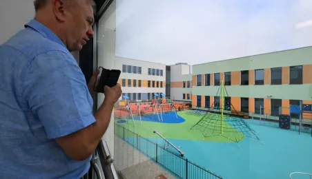 Prezydent Torunia Paweł Gulewski wraz z urzędnikami wizytował 12 lipca 2024 r. plac budowy Szkoły Podstawowej nr 12 przy ul. Strzałowej. Obecnie w obiekcie dobiegają końca prace zewnętrzne i wewnętrzne wykończeniowe oraz montaż osprzętu elektrycznego i sanitarnego wraz z wyposażeniem obiektu. Fot. © UMT 2024, autor: Sławomir Kowalski, licencja: CC BY-NC 4.0