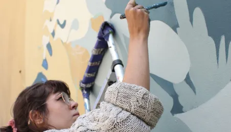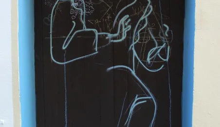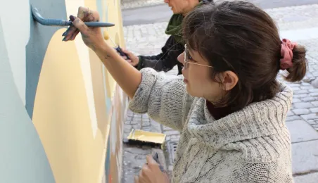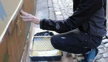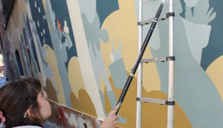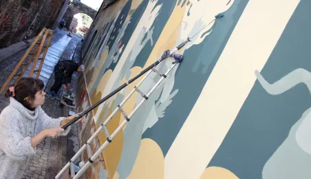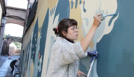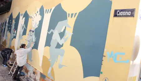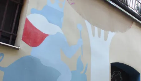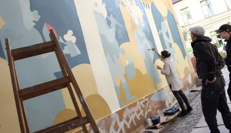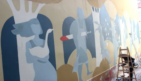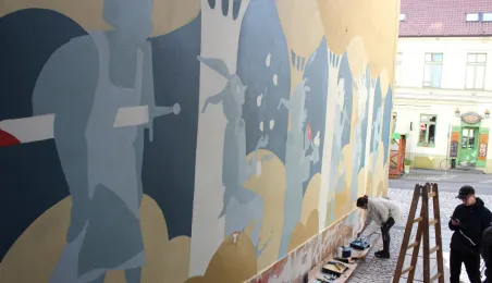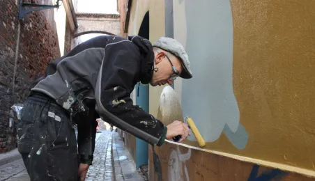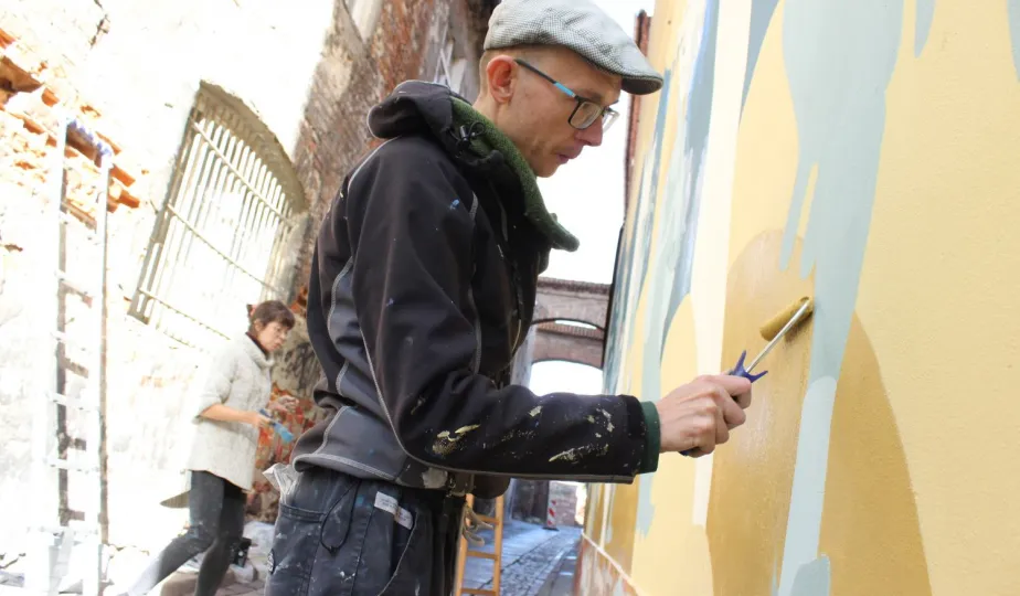 Na ścianie zabytkowej kamienicy przy ulicy Ciasnej w Toruniu powstaje nowy mural. Nawiązuje on do popularnego w późnym średniowieczu motywu alegorycznego tańca śmierci (danse macabre), w obliczu której wszyscy, bez względu na swój status, jesteśmy równi. Autorem murala jest artysta Andrzej Poprostu. Fot. Adam Zakrzewski