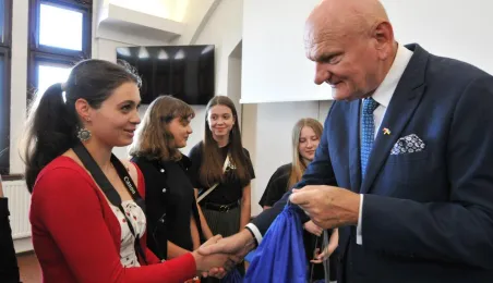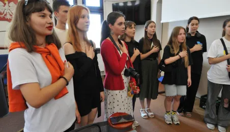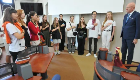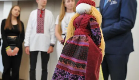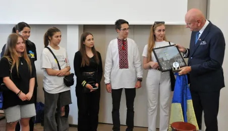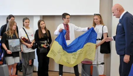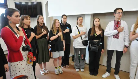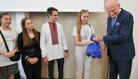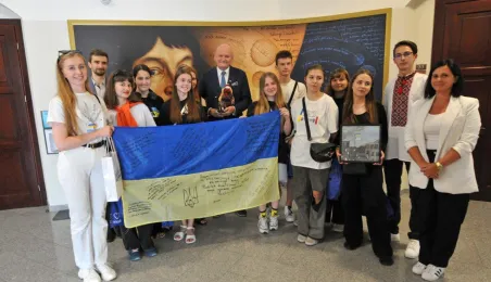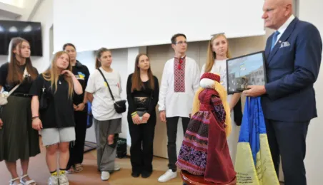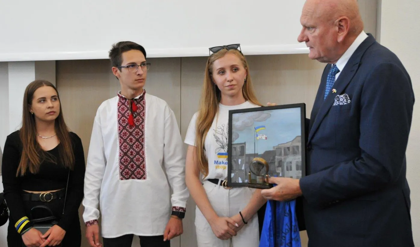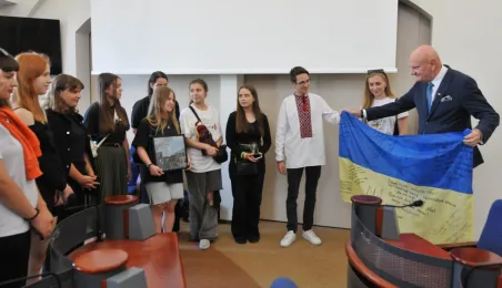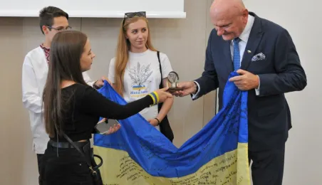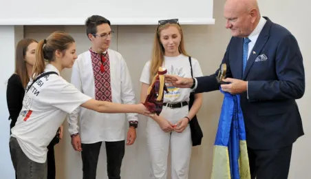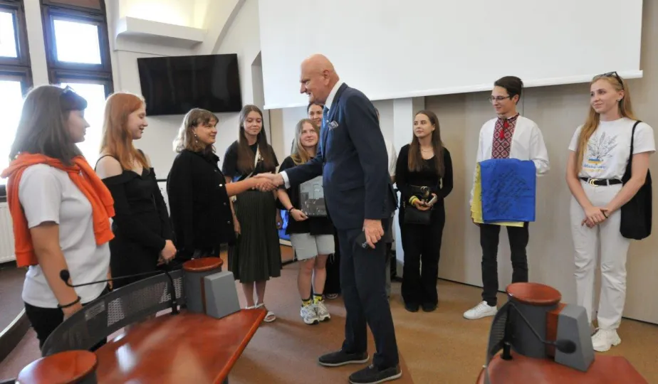 Toruń opuszcza grupa młodych wolontariuszy z Ukrainy. 23 września 2023 r. spotkał się z nimi prezydent Torunia Michał Zaleski. Młodzi ludzie z różnych miast Ukrainy m.in. ze Lwowa, Odessy, Żytomierza, Czernihowa, Mariupola i Połtawy przez miesiąc uczestniczyli w pracach Toruńskiego Sztabu Pomocy Ukrainie – jednej z kilku działających w Toruniu organizacji pozarządowych zajmujących się pomocą obywateli Ukrainy. W podziękowaniu za serdeczne przyjęcie w Toruniu uczestnicy wręczyli Michałowi Zaleskiemu flagę Ukrainy ze swoimi autografami, motankę czyli ukraińską laleczkę w stroju ludowym, statuetkę wykonaną z fragmentu rakiety oraz obrazek z flagą Toruńskiego Sztabu Pomocy Ukrainie osadzoną na ruinach zrujnowanego miasta. Fot. Małgorzata Litwin