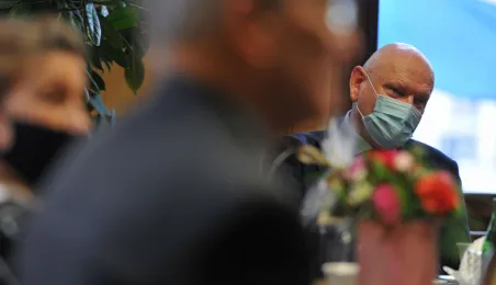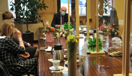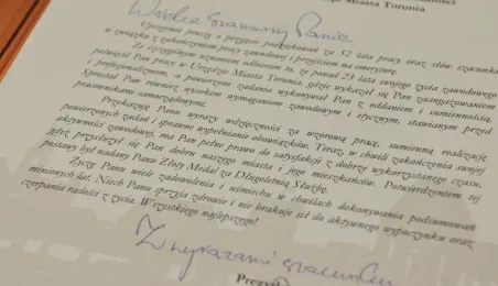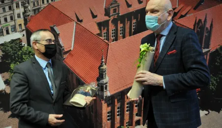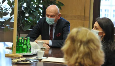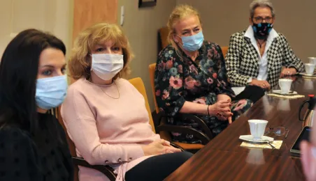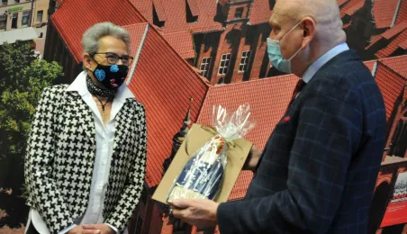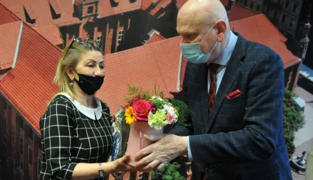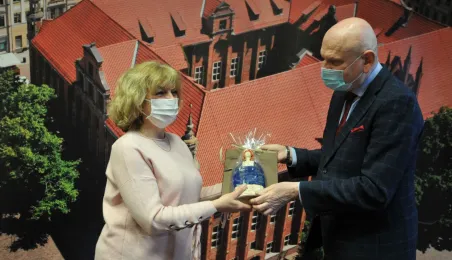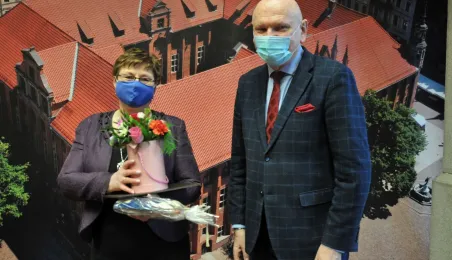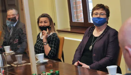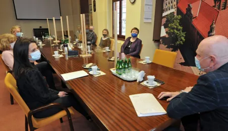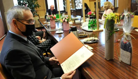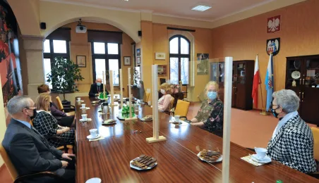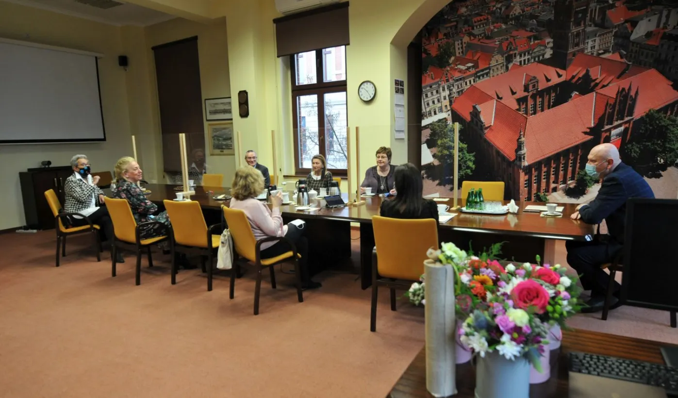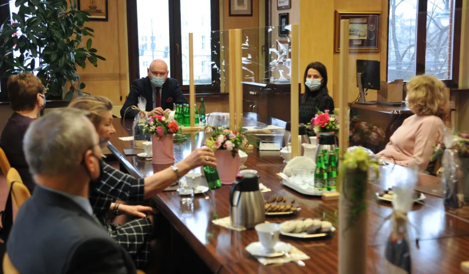 Prezydent Michał Zaleski spotkał się 4 marca 2021 r. z sześcioma długoletnimi pracownikami Urzędu Miasta Torunia, którzy w ostatnim czasie przeszli na emeryturę. Są to: Marianna Weronika Borończyk, Ewa Klein, Ewa Lewandowska, Mirosława Romaniszyn, Aleksandra Sass i Julian Skory. Fot. Małgorzata Litwin