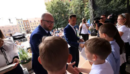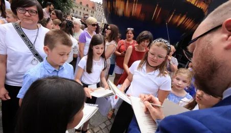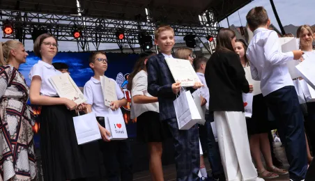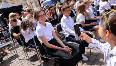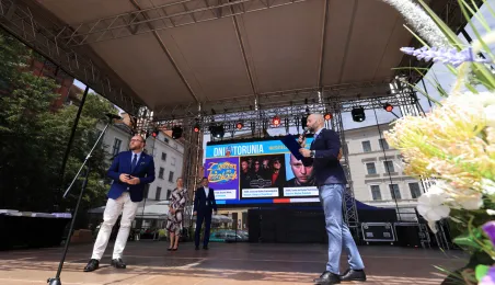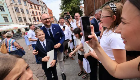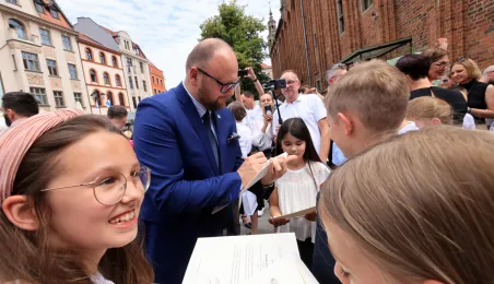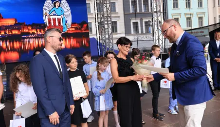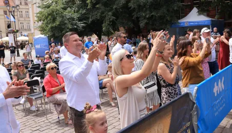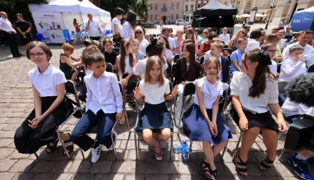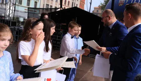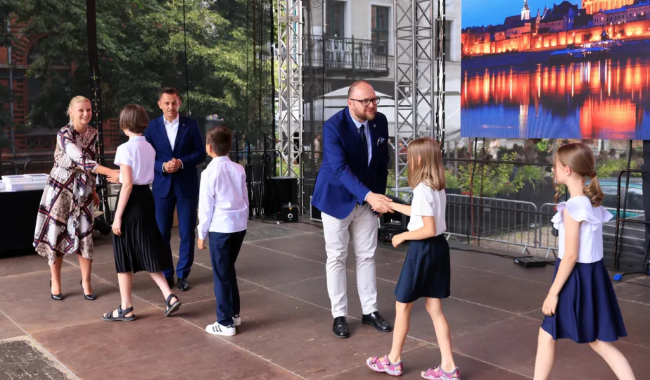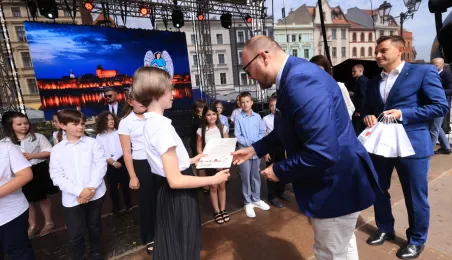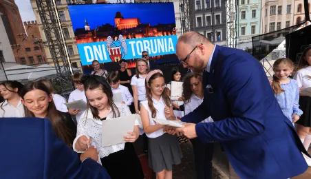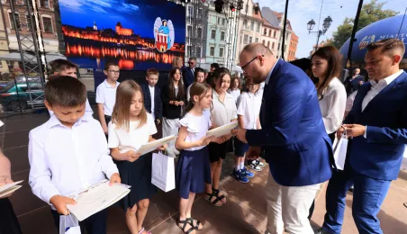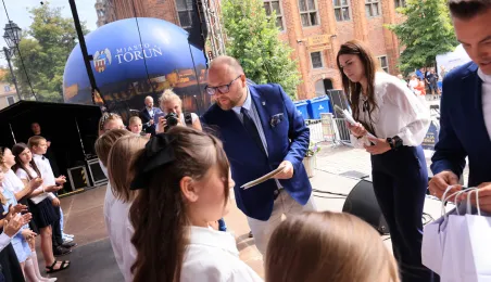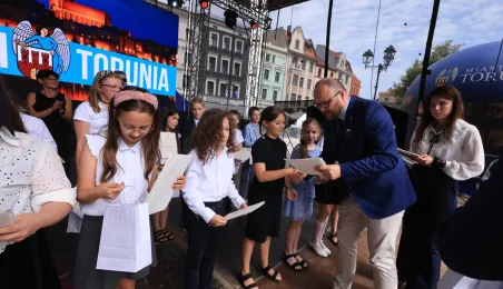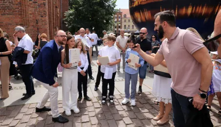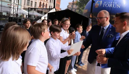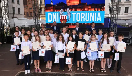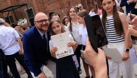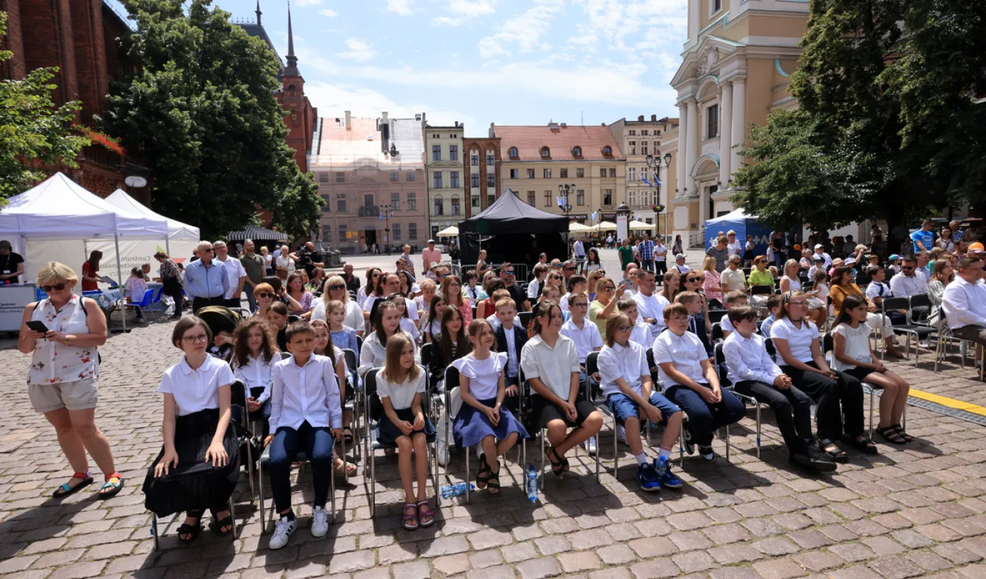 Najwyższą średnią ocen spośród wszystkich klas IV-VIII szkół podstawowych Gminy Miasta Toruń osiągnęła kl. IV B Szkoły Podstawowej nr 5 im. Romualda Traugutta w Toruniu. Zwycięzców poznaliśmy 21 czerwca 2024 r. podczas uroczystości na Rynku Staromiejskim. Fot. Sławomir Kowalski