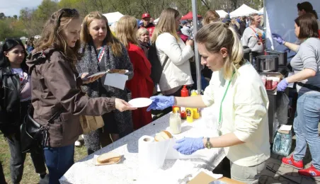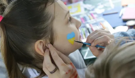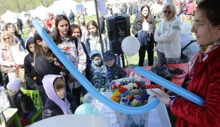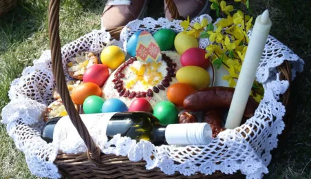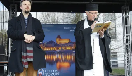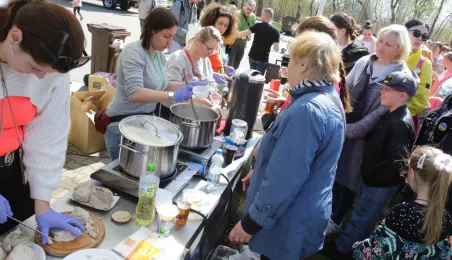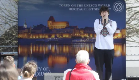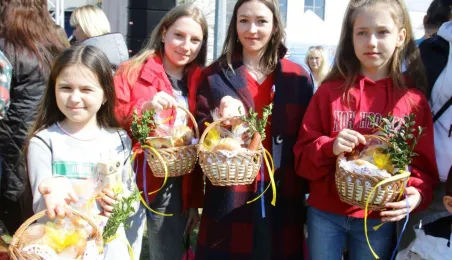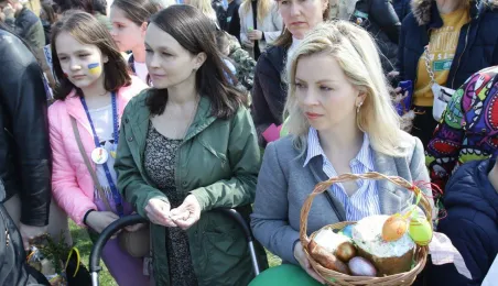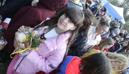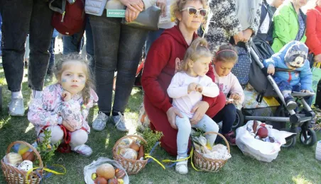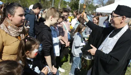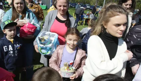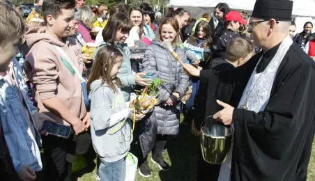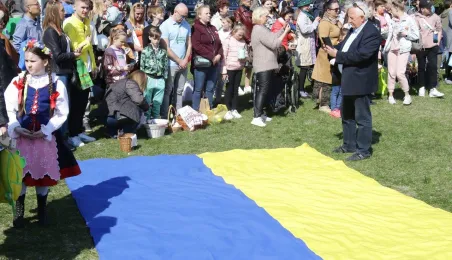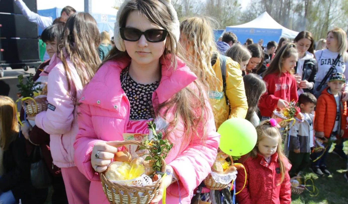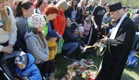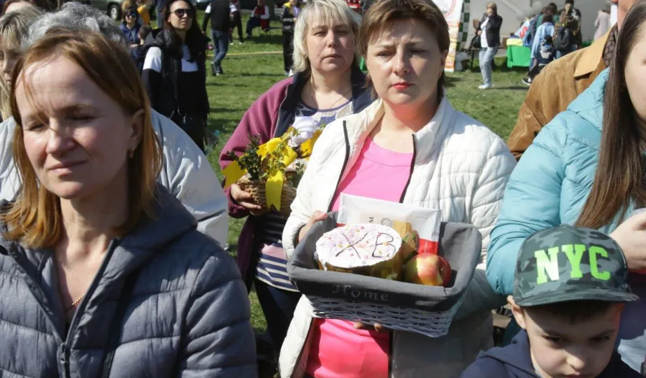 Podczas odbywającego się w dn. 23 kwietnia 2022 r. pikniku "Poznajmy się", z okazji przypadających w tym czasie prawosławnych Świąt Wielkanocnych, nastąpiło tradycyjne poświęcenie pokarmów. Na gości z Ukrainy czekały koszyczki, przygotowane przez Zespół Szkół Gastronomiczno-Hotelarskich, które poświęcił ks. Mikołaj Hajduczenia, proboszcz parafii prawosławnej pw. św. Mikołaja w Toruniu. Fot. Adam Zakrzewski