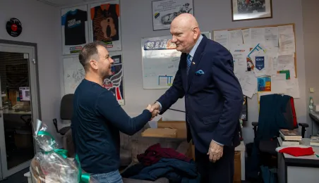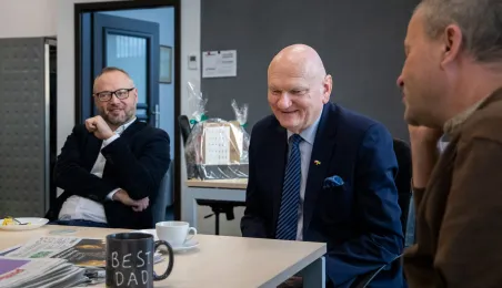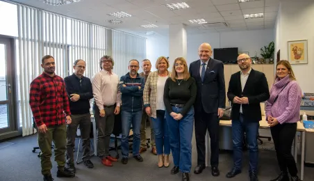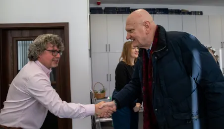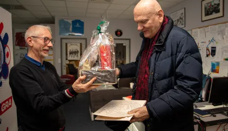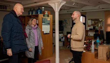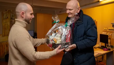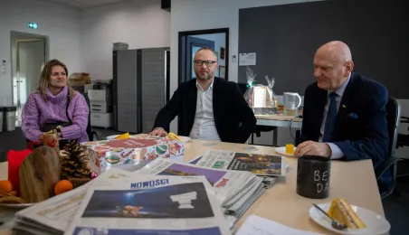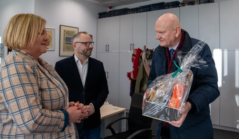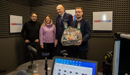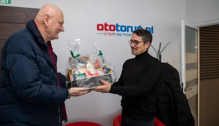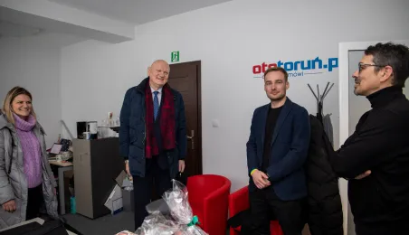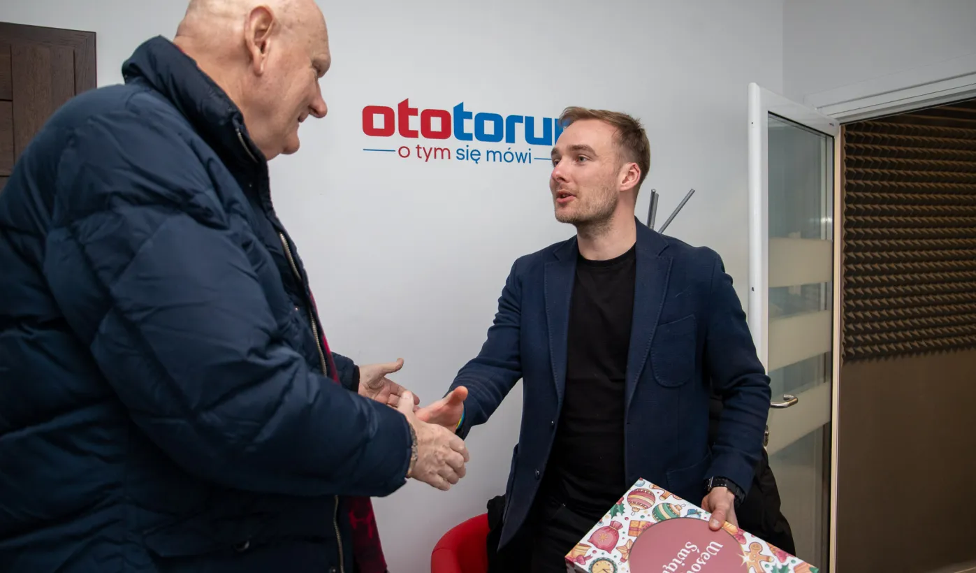 22 grudnia 2023 r. prezydent Michał Zaleski wraz z rzeczniczką prasową Malwiną Jeżewską odwiedzili toruńskie redakcje: "Nowości", Radio Gra, OtoToruń i TVP Bydgoszcz ze świątecznymi upominkami i życzeniami noworocznymi. Fot. Agnieszka Bielecka