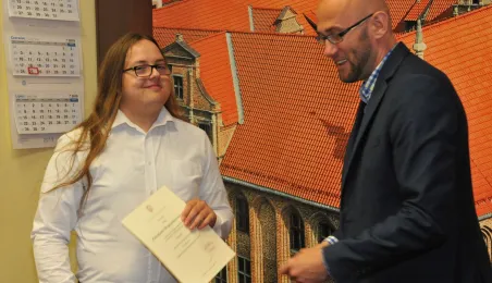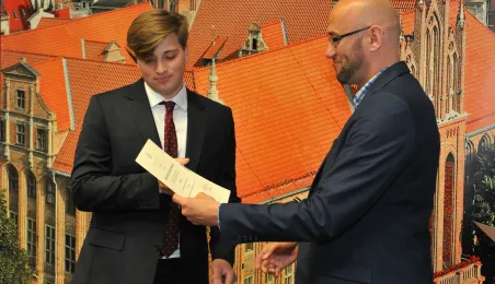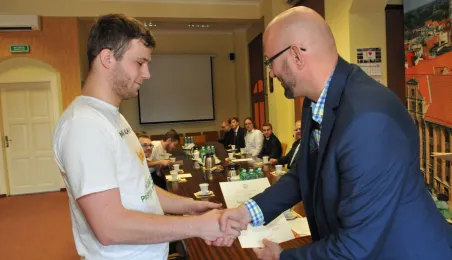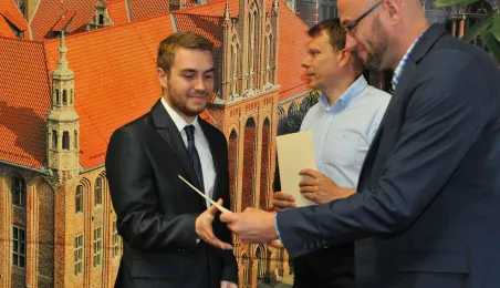 W Urzędzie Miasta Torunia 25 czerwca 2019 r. zostały wręczone nagrody finansowe, ufundowane przez Prezydenta Miasta Torunia w miejskim konkursie na najlepsze projekty studenckie stworzone w ramach przedmiotu "Programowanie zespołowe". Fot. Małgorzata Litwin