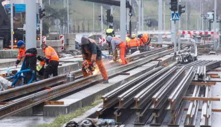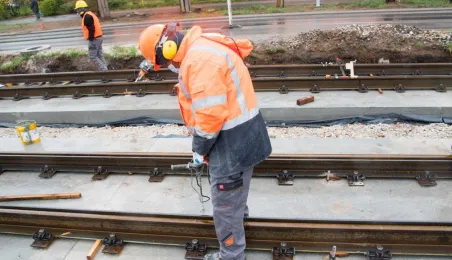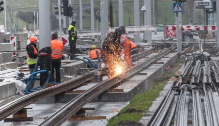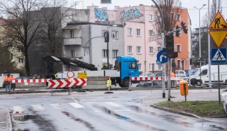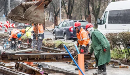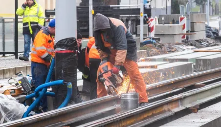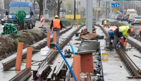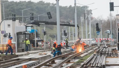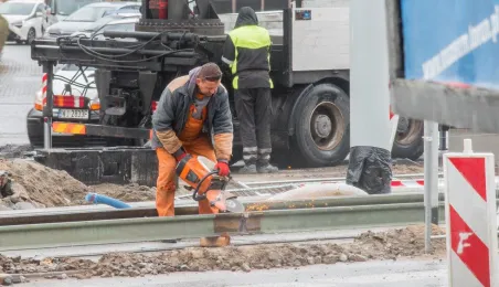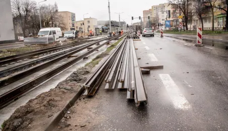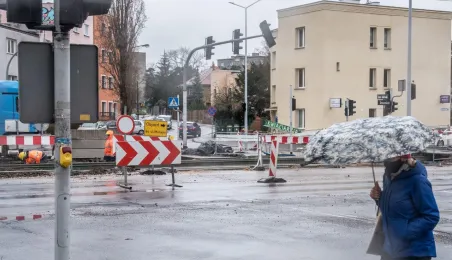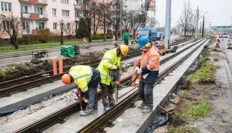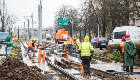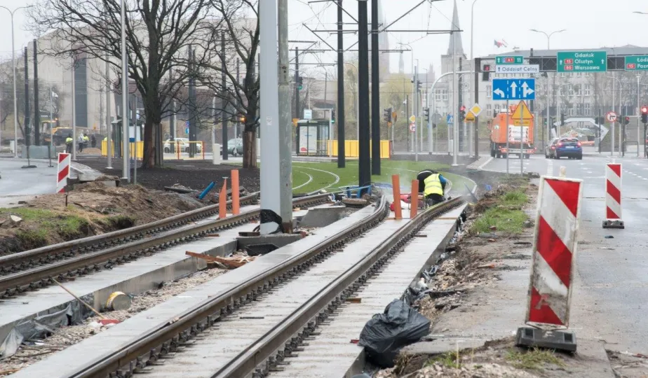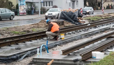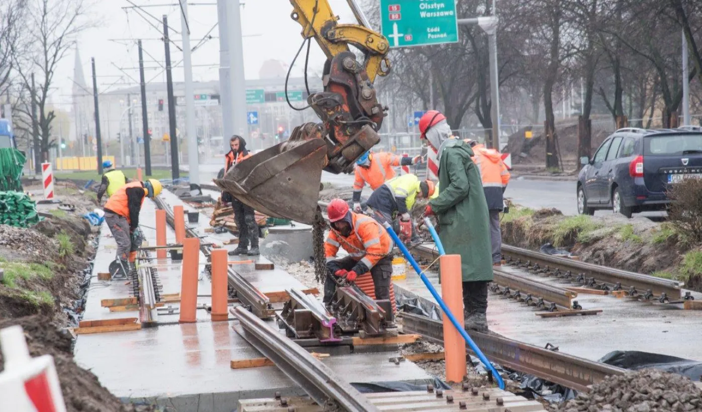 Niezależnie od pogody trwają prace związane z przebudową torowiska w ul. Kraszewskiego. Zadanie jest realizowane w ramach projektu "Poprawa funkcjonowania komunikacji miejskiej w Toruniu - BiT-City II", a jego wykonawcą jest firma Balzola. Fot. Lech Kamiński