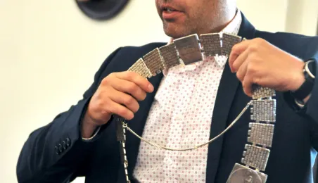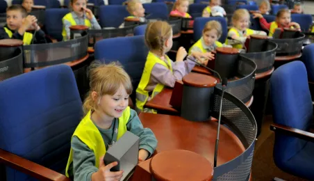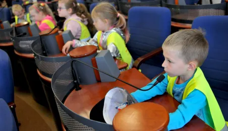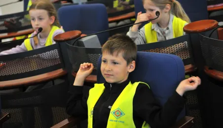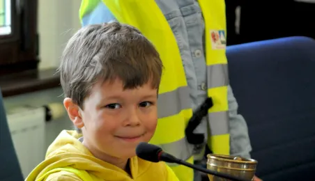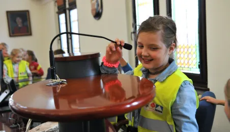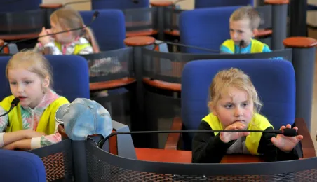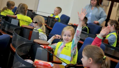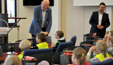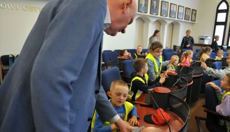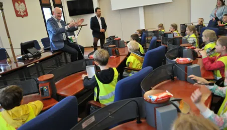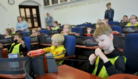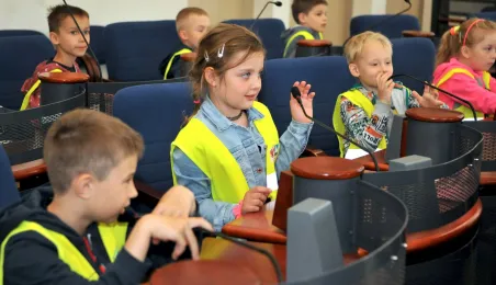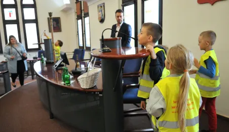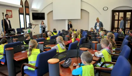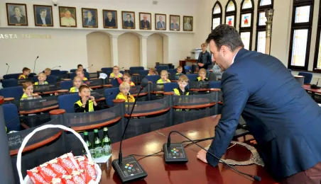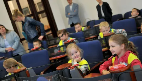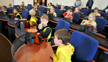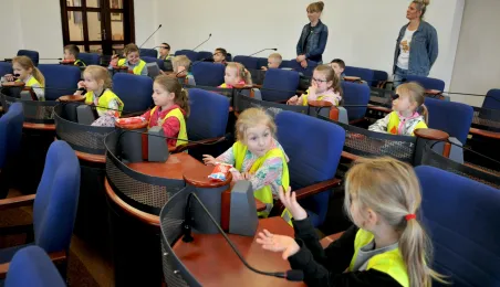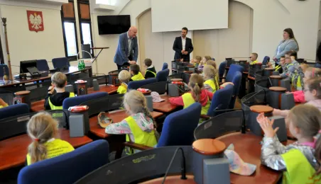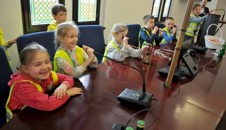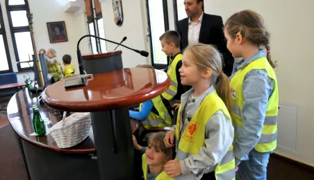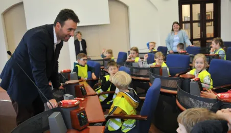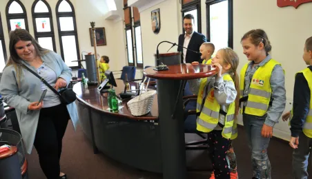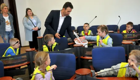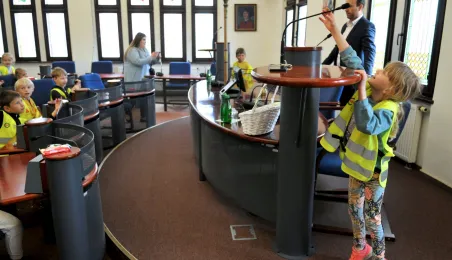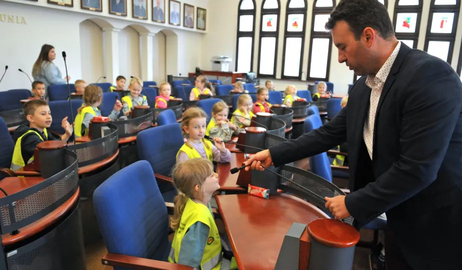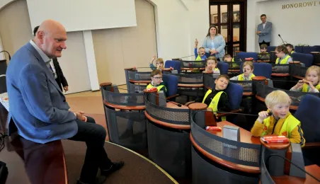 Urząd odwiedziły 25 maja 2022 r. dzieci z Przedszkola Miejskiego nr 5 przy ul. Dekerta w Toruniu. Spotkali się z nimi radny Bartłomiej Jóźwiak, inicjator spotkania, i prezydent Torunia Michał Zaleski. Fot. Małgorzata Litwin