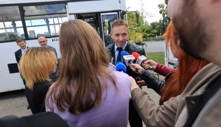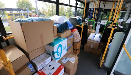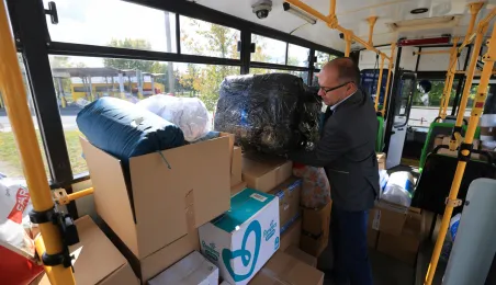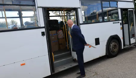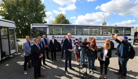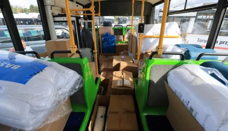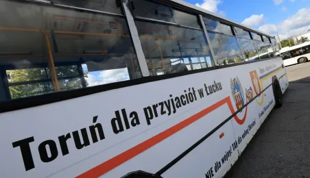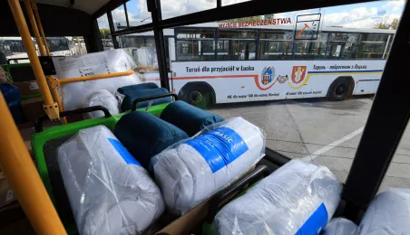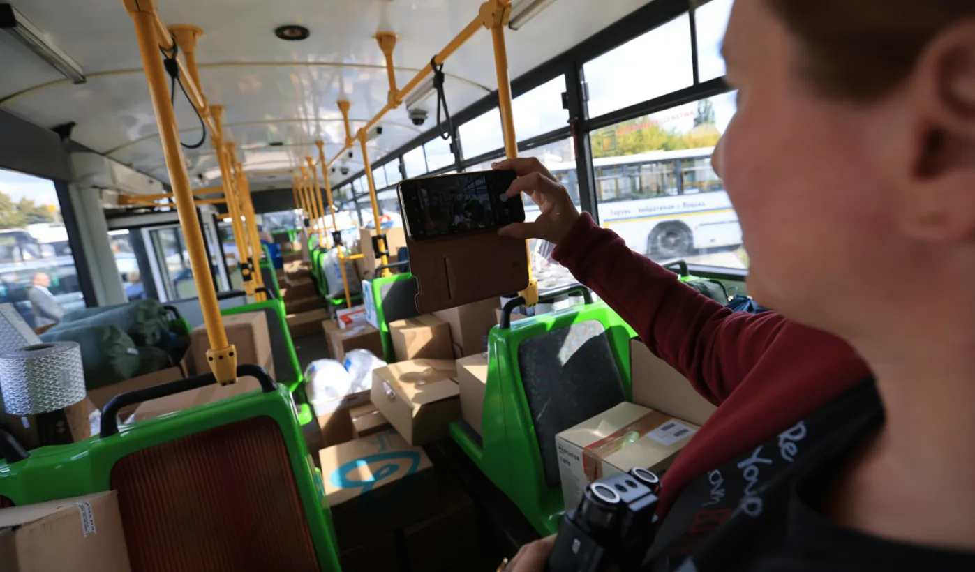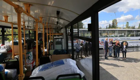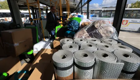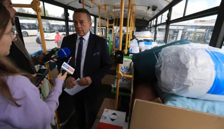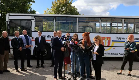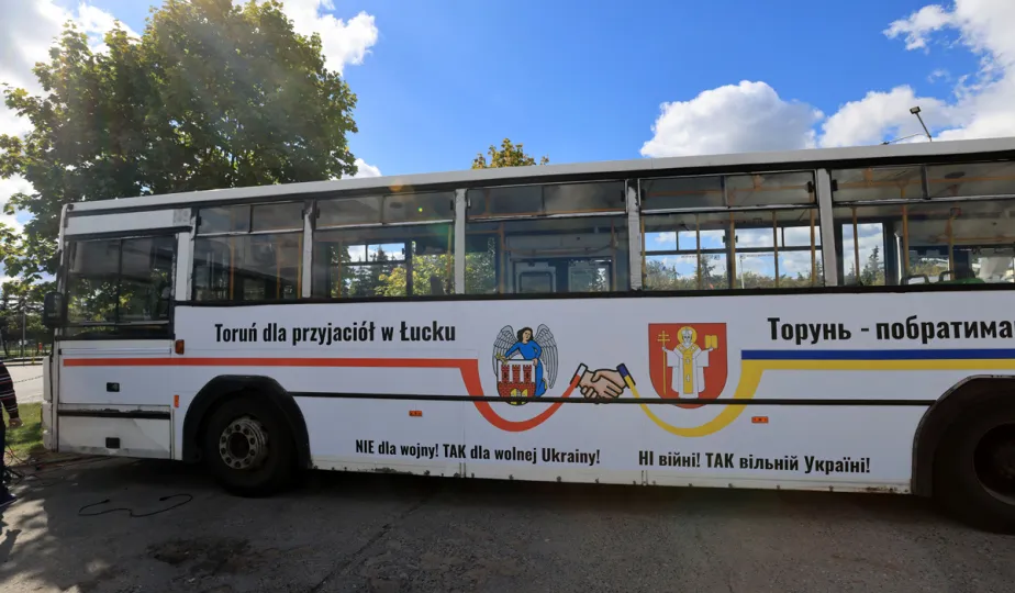 Miasto Toruń przekazuje partnerskiemu Łuckowi w Ukrainie pięć miejskich autobusów - spotkanie z tej okazji odbyło się 12 wrzesnia 2022 r. w zajezdni MZK. Pojazdy wypełnione darami wyruszą 13 września 2022 r. Fot. Sławomir Kowalski