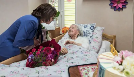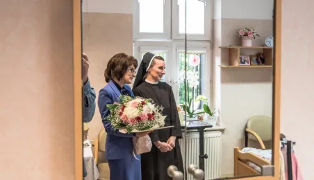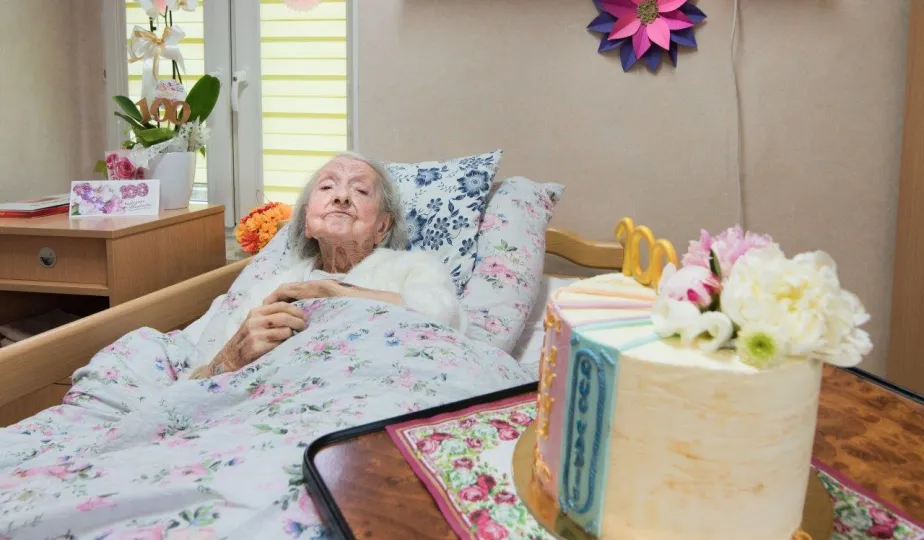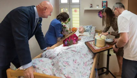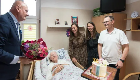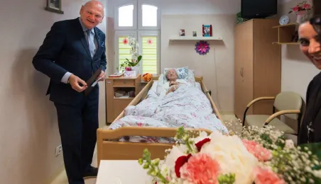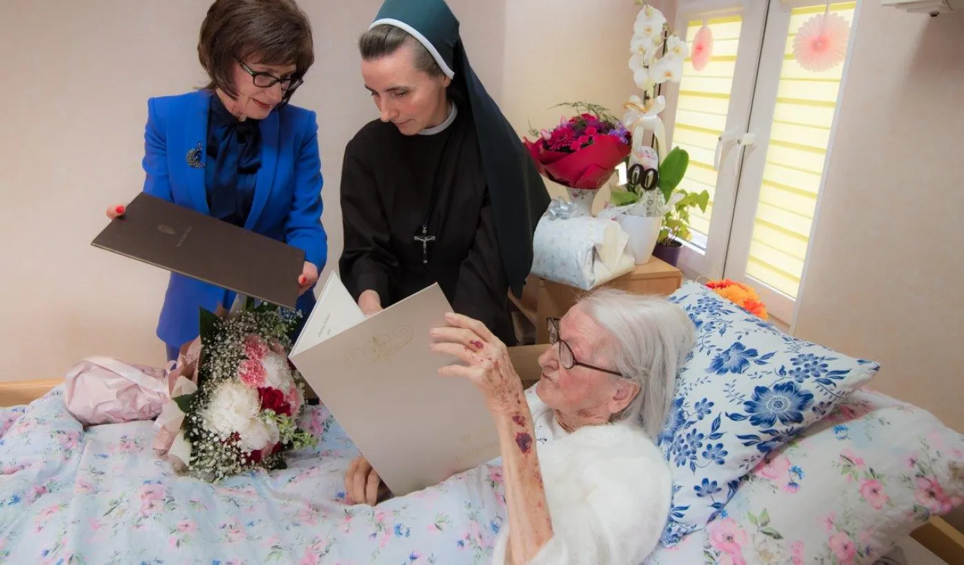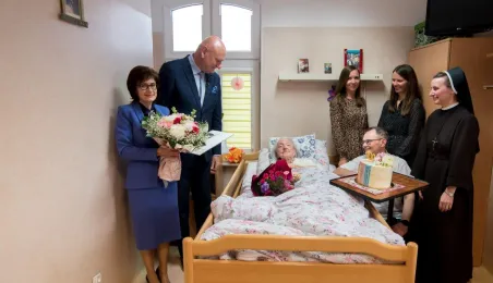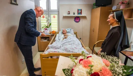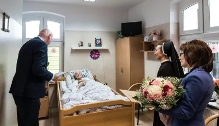 Pani Anna Jastrzębska, mieszkanką Torunia, skończyła sto lat. Do życzeń dla jubilatki przyłączył się prezydent Michał Zaleski, który odwiedził dostojną jubilatkę w dniu 13 czerwca 2022 r. z bukietem kwiatów i upominkiem. Fot. Lech Kamiński