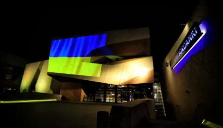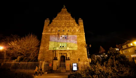 Kilka charakterystycznych obiektów w Toruniu przybrało 25 lutego 2022 r. żółto-niebieskie barwy w ramach solidarności z walczącą Ukrainą. Symboliczne podświetlenie pojawiło się na moście marsz. J. Piłsudskiego, budynkach CKK Jordanki, Collegium Maximum UMK i sportowej Areny Toruń. Codziennie pod pomnikiem Kopernika kolejne osoby, Polacy i Ukraińcy, manifestują poparcie dla broniącego swojej niezawisłości narodu. Fot. Sławomir Kowalski