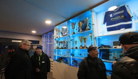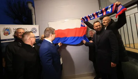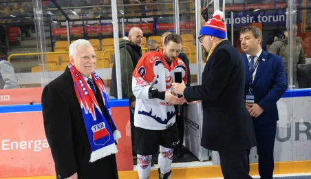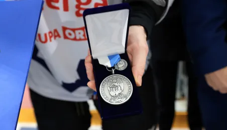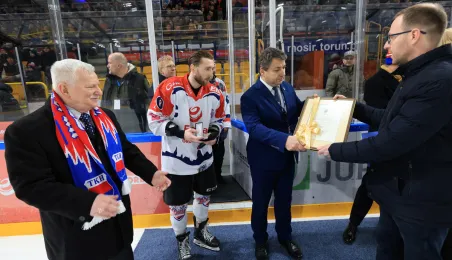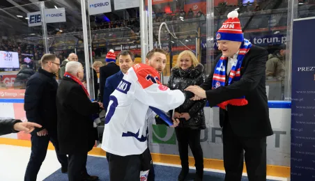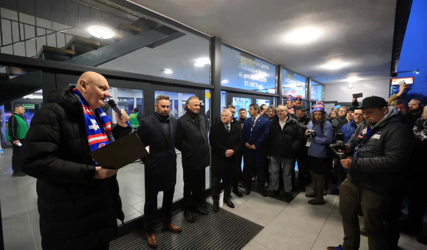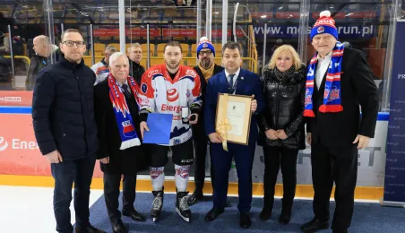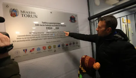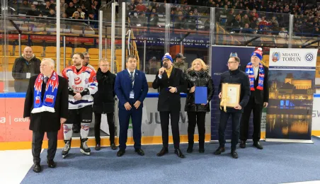 Tablica pamiątkowa na budynku lodowiska Tor-Tor oraz medal „Za Zasługi dla Miasta Torunia” na wstędze dla Klubu Sportowego Toruń Hokejowa Spółka Akcyjna – tak miasto uhonorowało 5 marca 2024 r. 100-lecie hokeja na lodzie w Toruniu. Po uroczystościach na lodowisku Tor-Tor odbył się mecz rundy play off pomiędzy KH Energa Toruń a JKH GKS Jastrzębie, który zakończył się wynikiem 1:2. Fot. Sławomir Kowalski