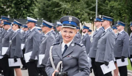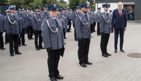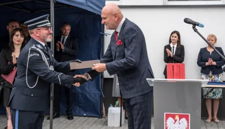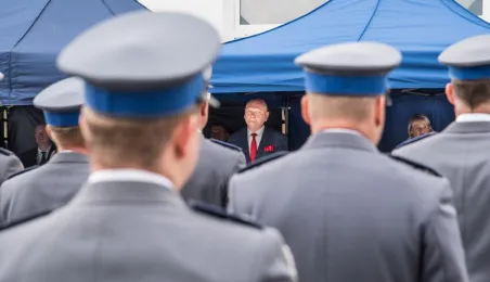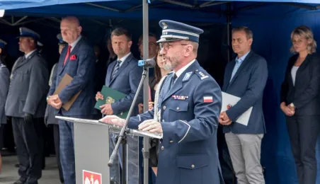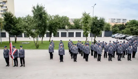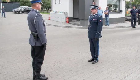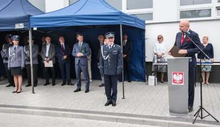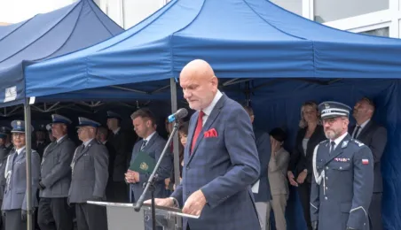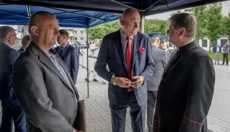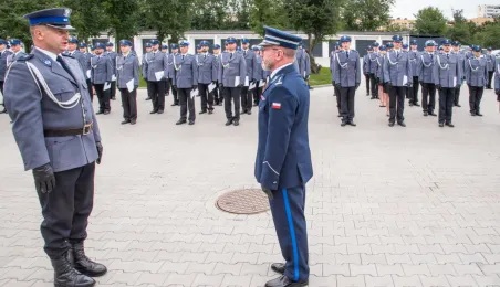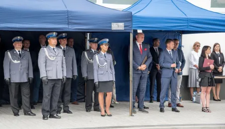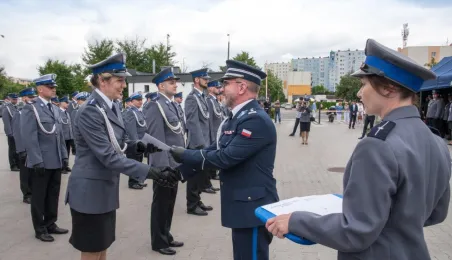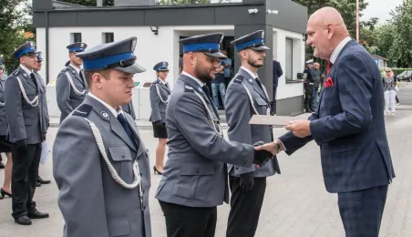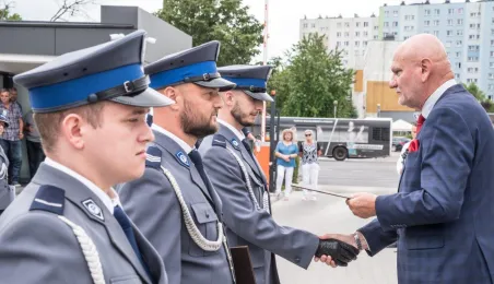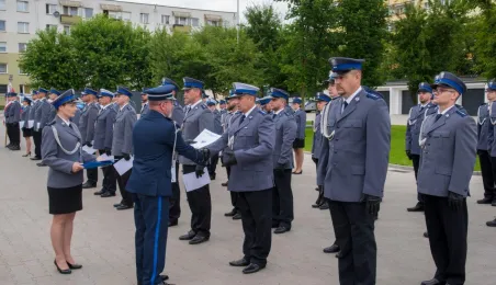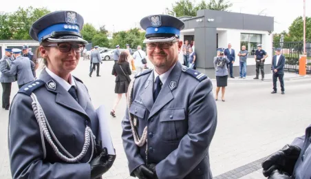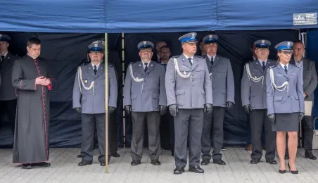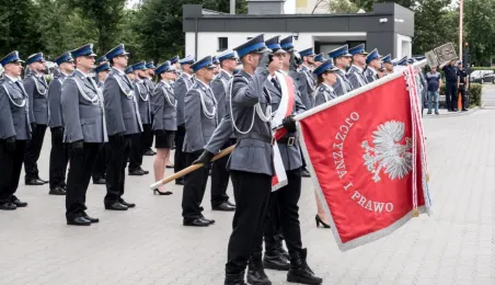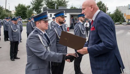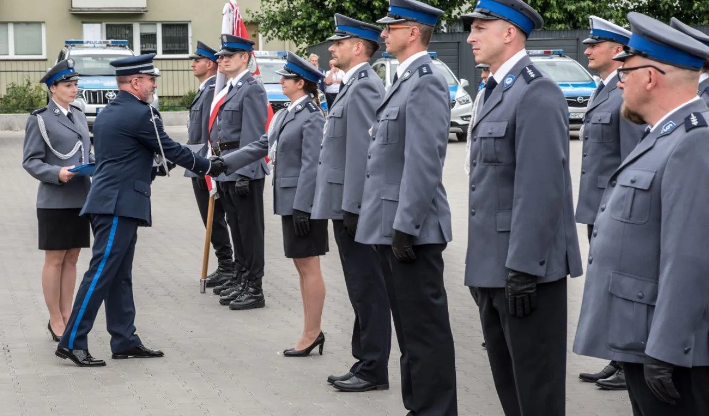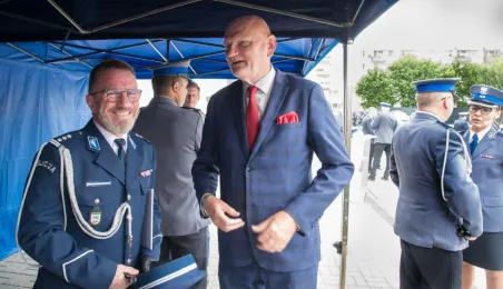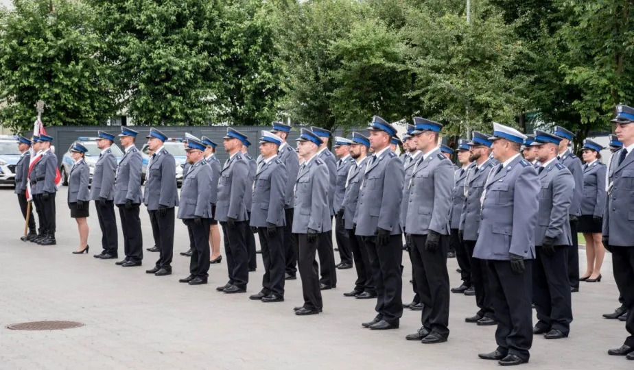 Uroczyste obchody Święta Policji odbyły się na terenie komisariatu nr 1 przy ul. Dziewulskiego w dniu 21 lipca 2021 r. Była to także okazja do wręczenia nominacji na wyższe stopnie. Swoje nagrody zasłużonym funkcjonariuszom przyznali prezydent miasta i starosta. Fot. Lech Kamiński