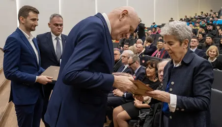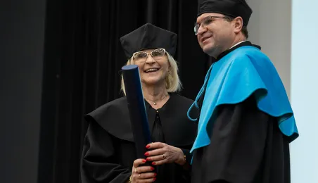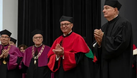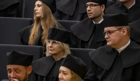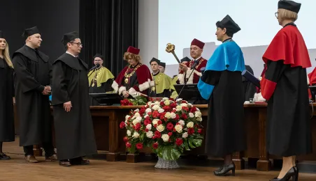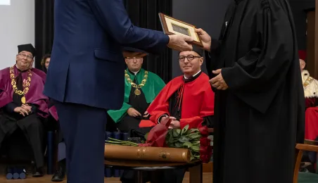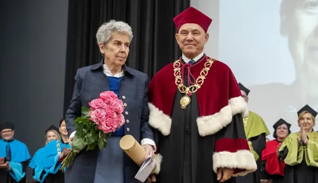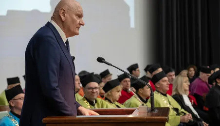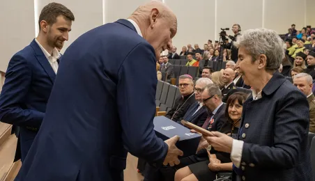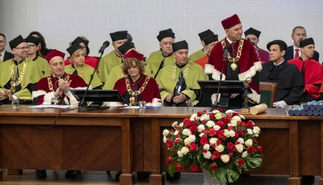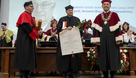 Podczas tegorocznego Święta Uniwersytetu Mikołaja Kopernika (19 lutego 2024 r.) nadano wybitnemu urologowi prof. Jerzemu Bogdanowi Gajewskiemu tytuł doktora honoris causa UMK. Laureatką międzynarodowej Nagrody Naukowej "Ratio et Spes" została w tym roku prof. Chantal Delsol. Ponadto przyznano szereg innych ważnych odznaczeń, medali i wyróżnień – zarówno państwowych, jak i uniwersyteckich. Fot. Wojtek Szabelski