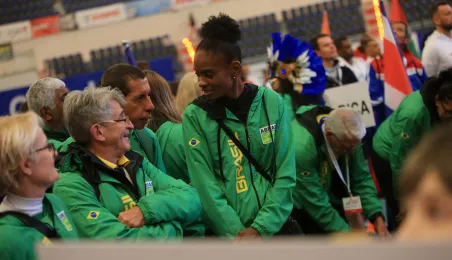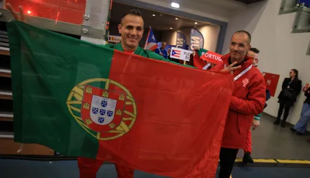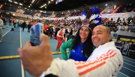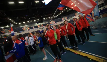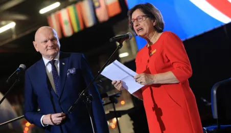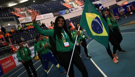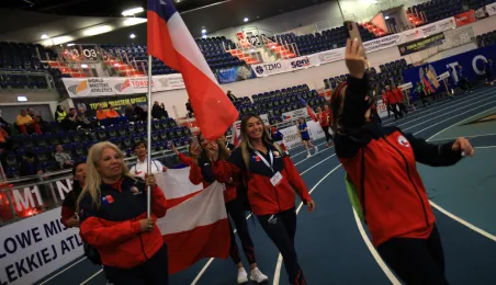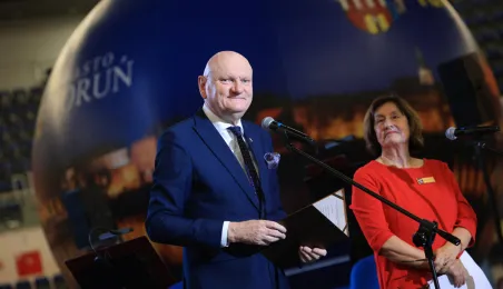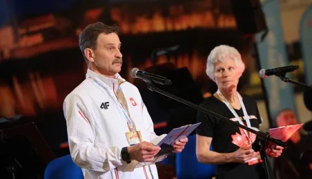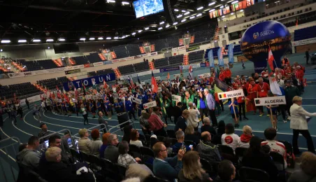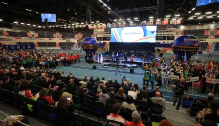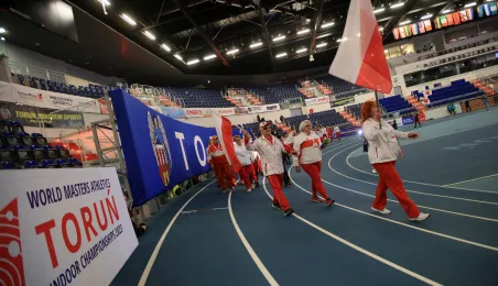 - To dla nas zaszczyt i radość, że możemy gościć Was w naszym pięknym zabytkowym Toruniu, gdzie Stare Miasto wpisane jest na listę Światowego Dziedzictwa Kultury UNESCO. Życzę wszystkim, aby czas spędzony w Toruniu był czasem dobrze spędzonym, aby te mistrzostwa pozostały na zawsze w pamięci - tymi słowami prezydent Torunia Michał Zaleski otworzył 9. Halowe Mistrzostwa Świata w Lekkiej Atletyce Masters 2023. Zdj. Sławomir Kowalski