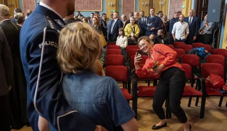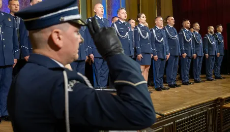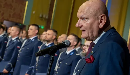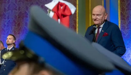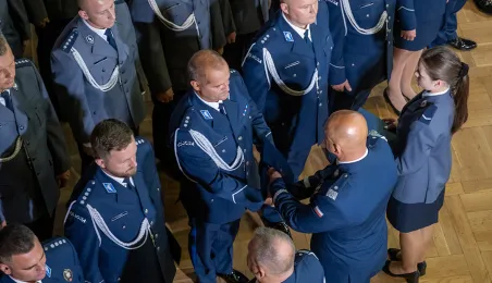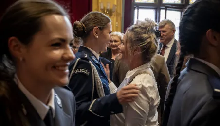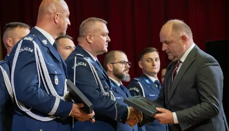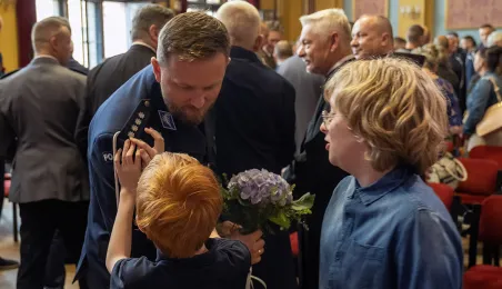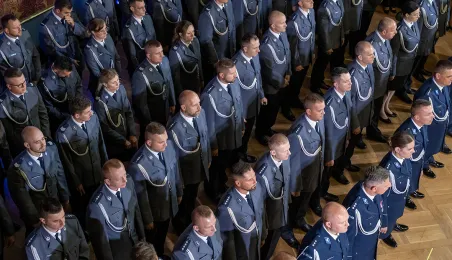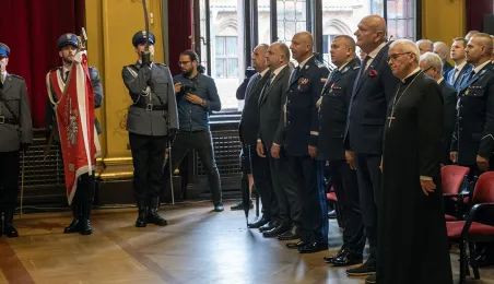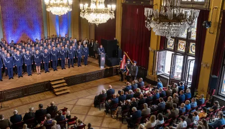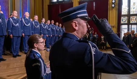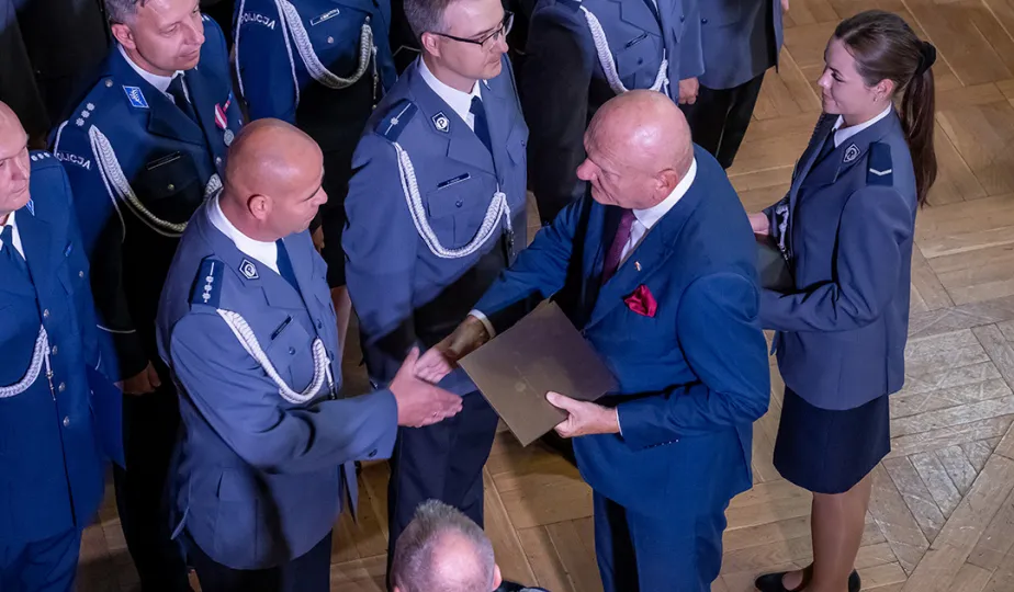 Uroczysty apel z okazji obchodów Święta Policji i 104. rocznicy powołania policji państwowej, który odbył się w piątek 28 lipca 2023 r. w Dworze Artusa był okazją do uhonorowania wszystkich, którzy w sposób szczególny przyczyniają się do efektywnej i skutecznej pracy policji na rzecz bezpieczeństwa mieszkańców Torunia i powiatu toruńskiego. Fot. Wojtek Szabelski