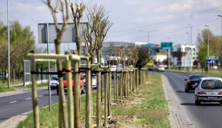 Plac ToMiTo i ul. Marii Skłodowskiej-Curie to kolejne miejsca w Toruniu, w których wiosną 2020 r. nasadzone zostały nowe drzewa, zaopatrzone w worki do kropelkowego podlewania typu treegator. Fot. Sławomir Kowalski