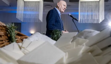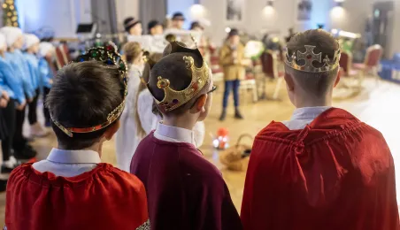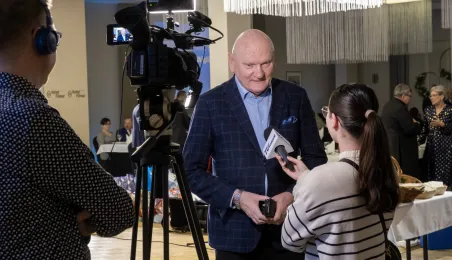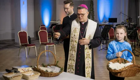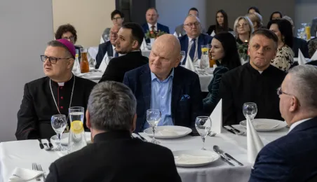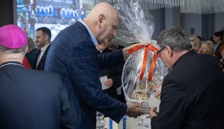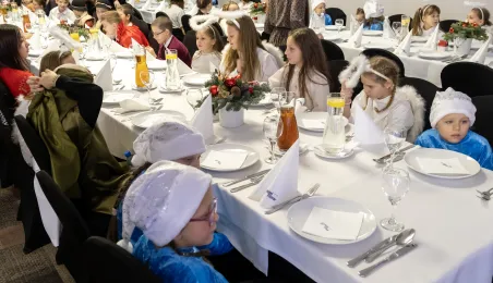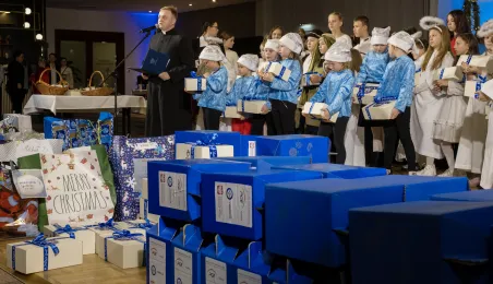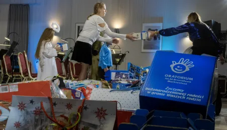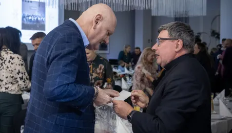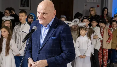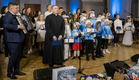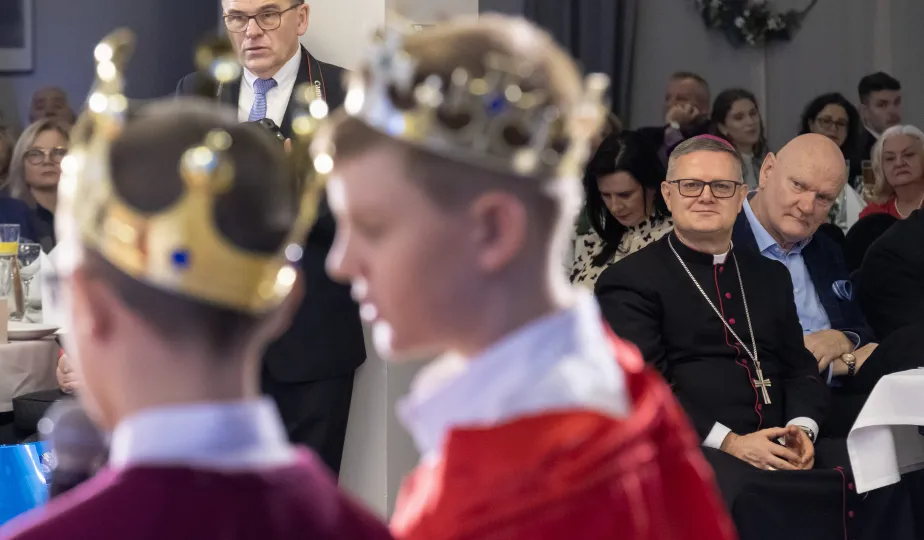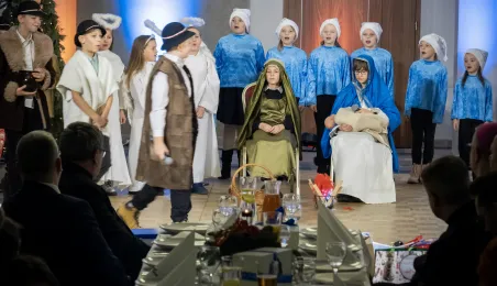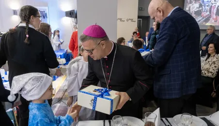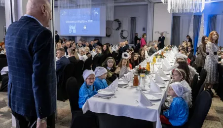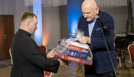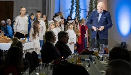 W Hotelu Filmar w Toruniu 17 grudnia 2023 r. odbył się Wieczór Wigilijny Oratorium im. ks. B. Markiewicza. W spotkaniu wziął udział prezydent Torunia Michał Zaleski, który przywiózł dzieciom prezenty i złożył najserdeczniejsze życzenia świąteczne. Fot. Wojtek Szabelski