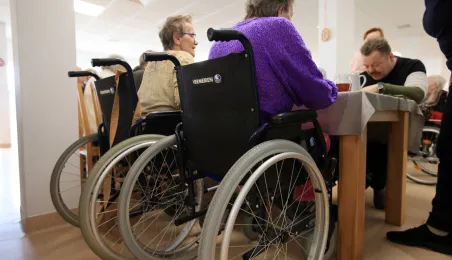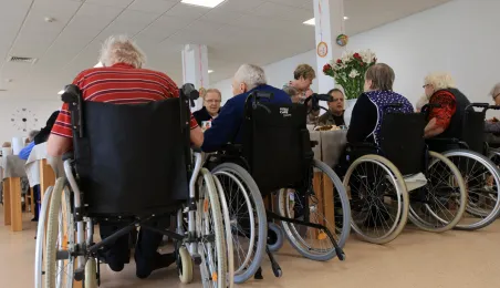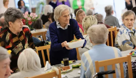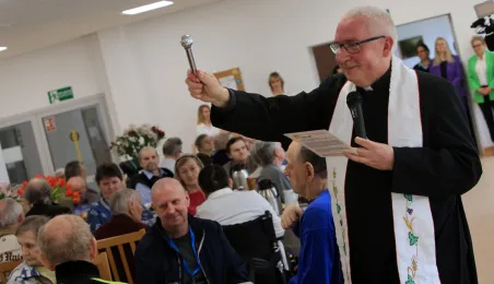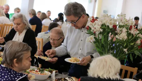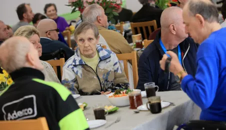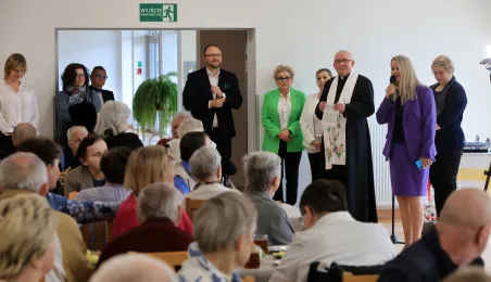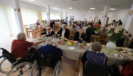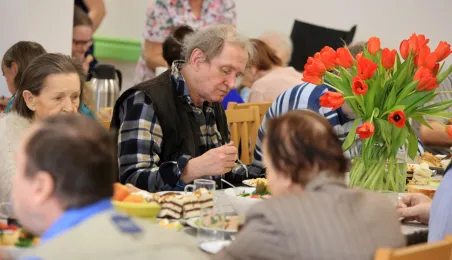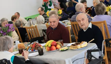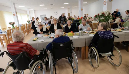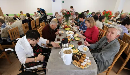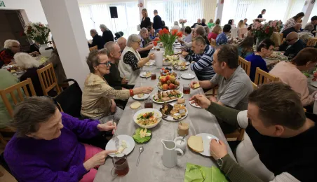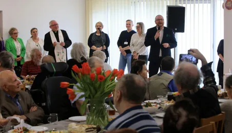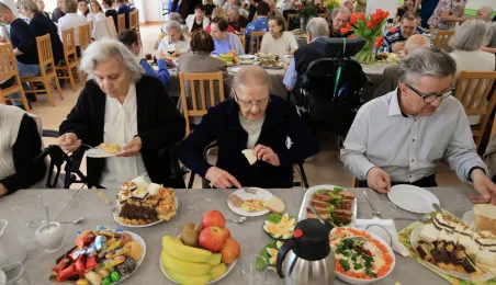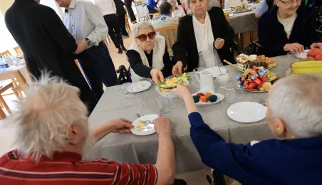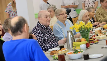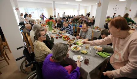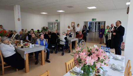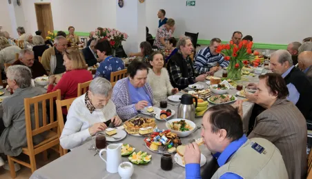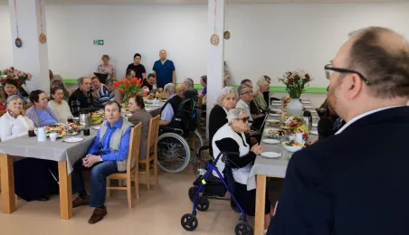 W środę 5 kwietnia 2023 r. mieszkańcy i pracownicy Domu Pomocy Społecznej im. Leona Szumana w Toruniu zasiedli do wspólnego, wielkanocnego śniadania. Życzenia złożył im zastępca prezydenta Torunia Paweł Gulewski. Przed posiłkiem nastąpiło tradycyjnie poświęcenie wielkanocnych pokarmów przez ks. Wojciecha Miszewskiego z sąsiadującej z placówką parafii św. Antoniego na Wrzosach. Fot. Sławomir Kowalski