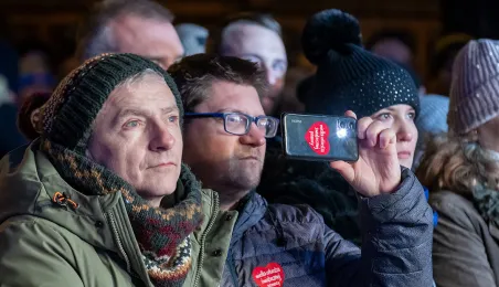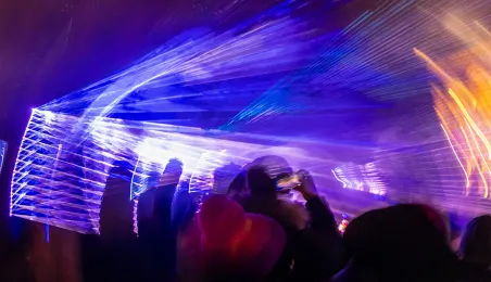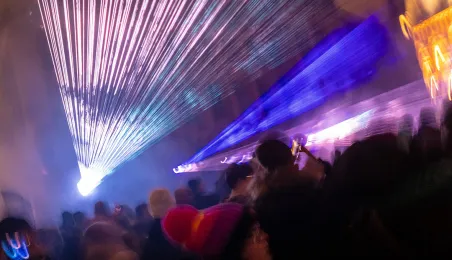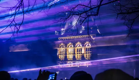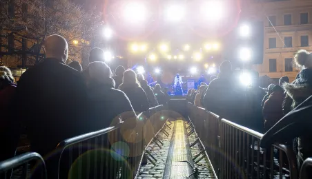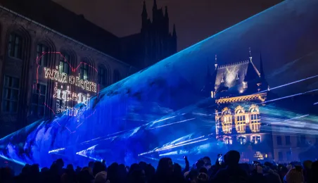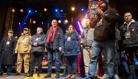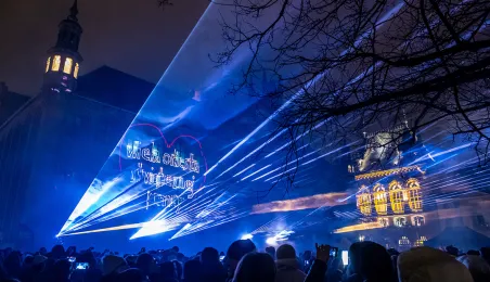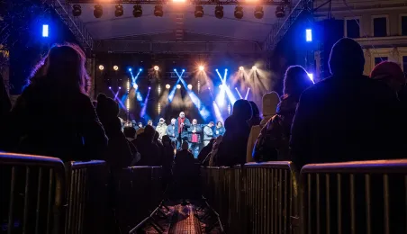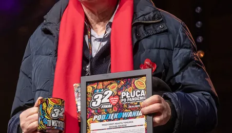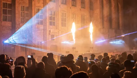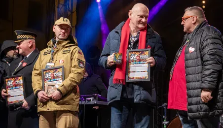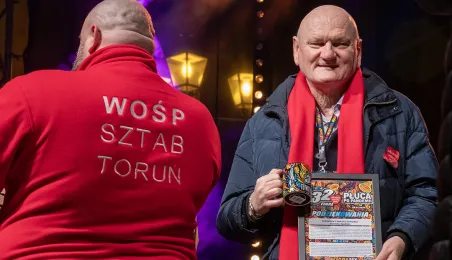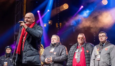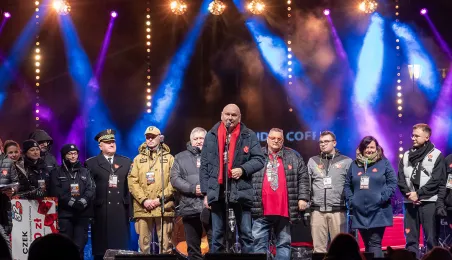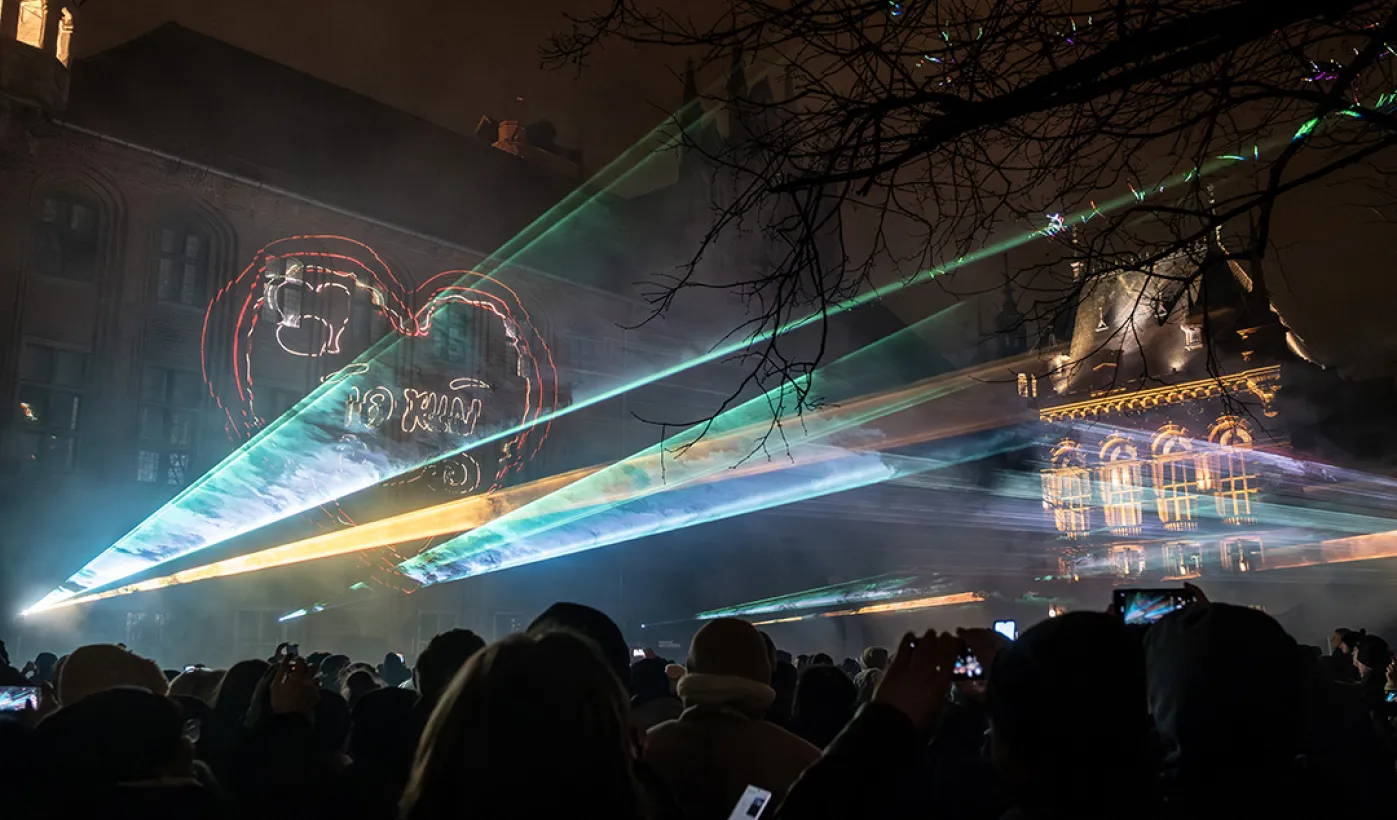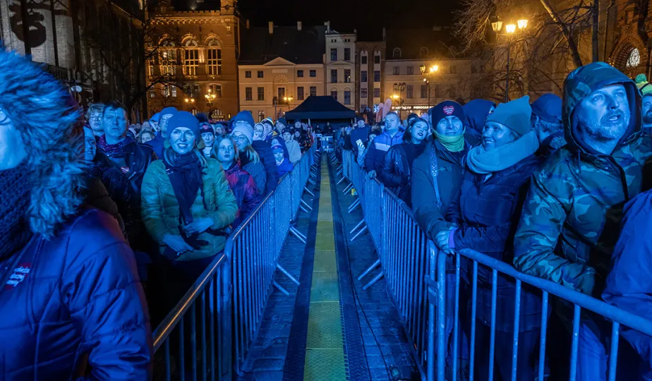 28 stycznia 2024 r. laserowy pokaz pn. "Światełko do nieba" zakończył finał Wielkiej Orkiestry Świątecznej Pomocy 2024 w Toruniu. Po pokazie zebrani wzięli udział w koncercie zespołu Tabu. Fot. Wojtek Szabelski