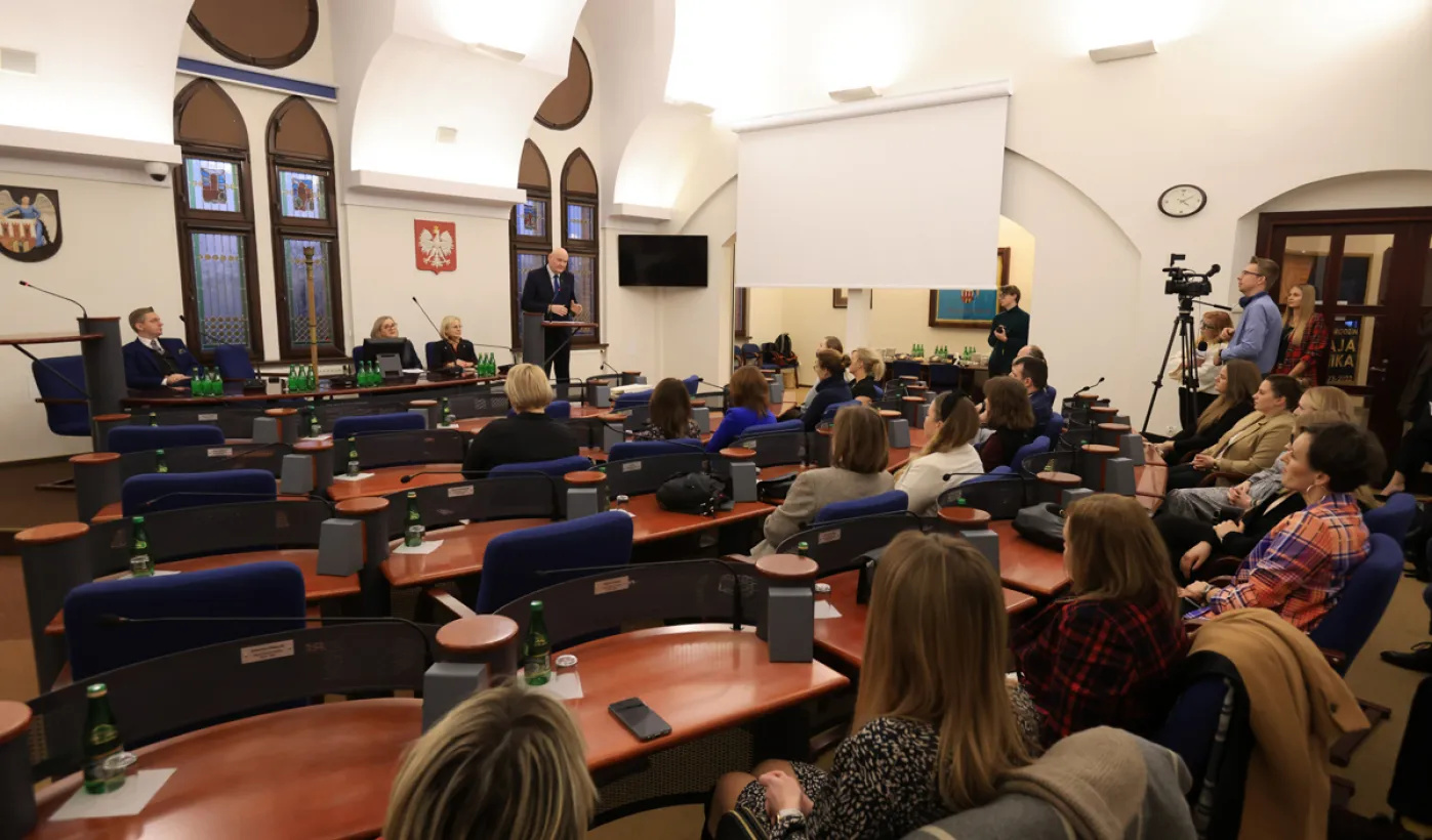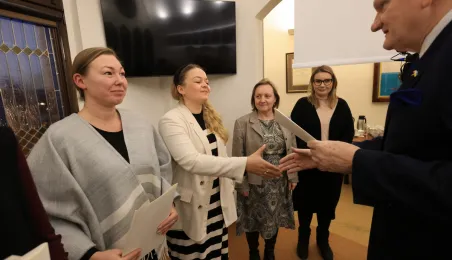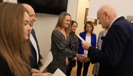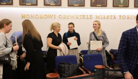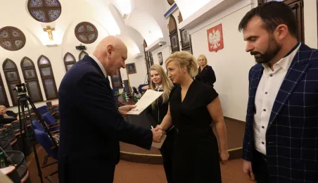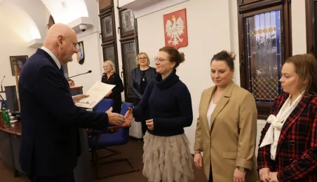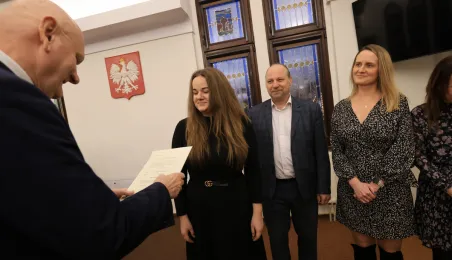 9 stycznia 2024 r. w sali Rady Miasta Torunia prezydent Michał Zaleski wręczył akty mianowania 21 toruńskim nauczycielom. Fot. Sławomir Kowalski