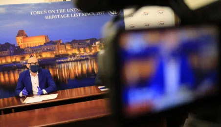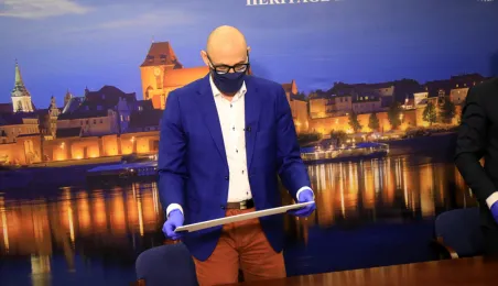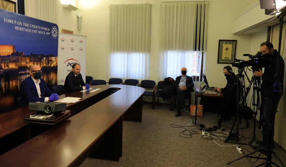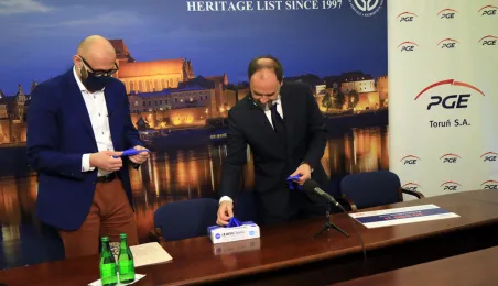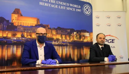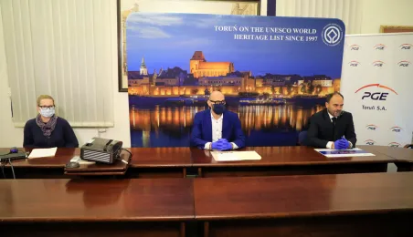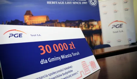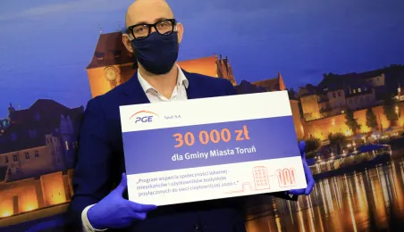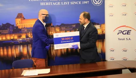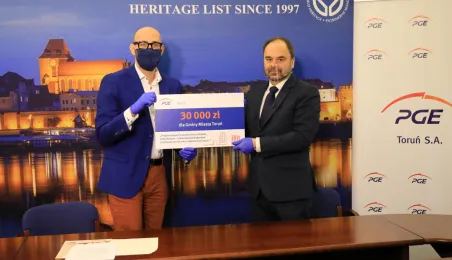 Dzięki programowi realizowanemu przez spółkę PGE, Toruń pozyskał 30 tys. zł wsparcia dla inicjatyw lokalnych. W dniu 30 listopada 2020 r. zastępca prezydenta Zbigniew Rasielewski odebrał symboliczny czek z nagrodą z rąk Adama Banaszaka – wiceprezydenta zarządu PGE Toruń. Fot. Sławomir Kowalski