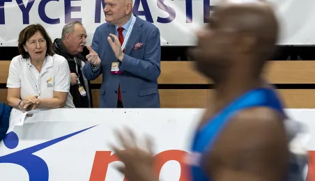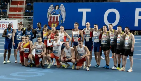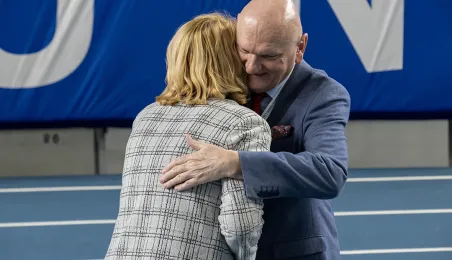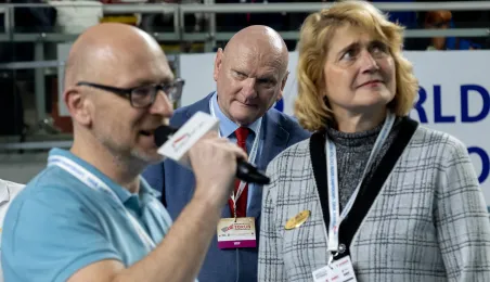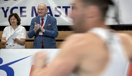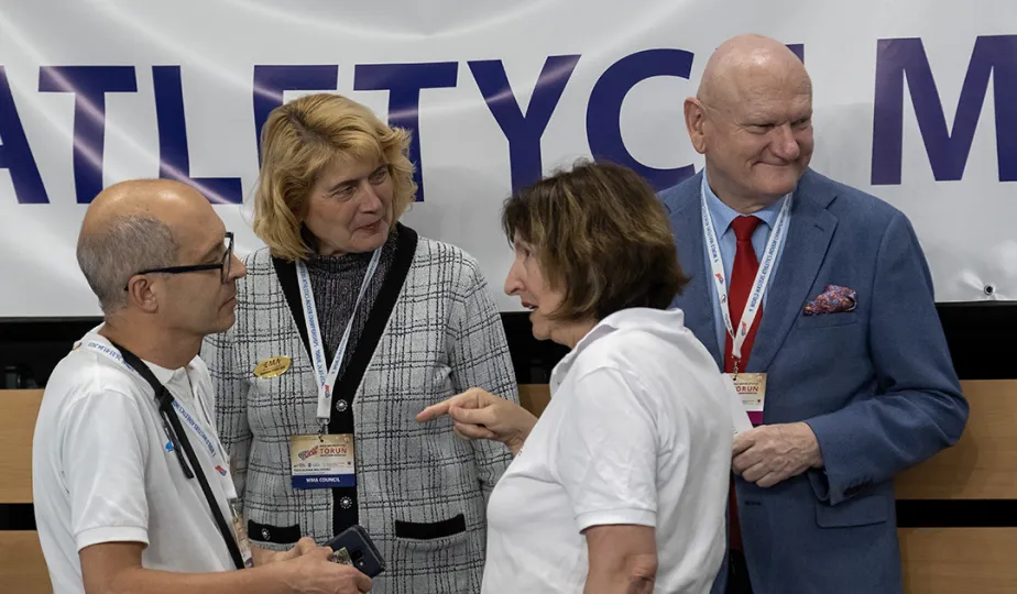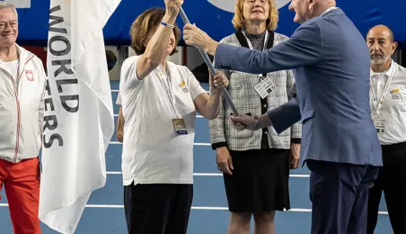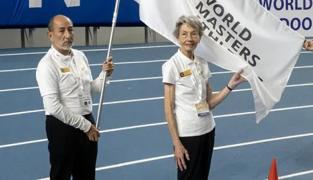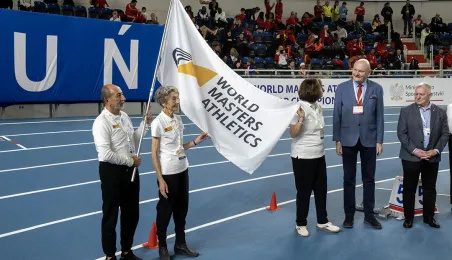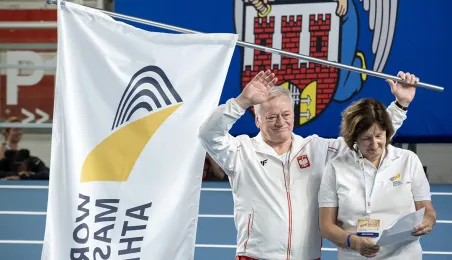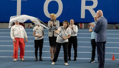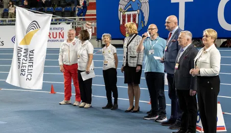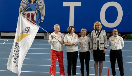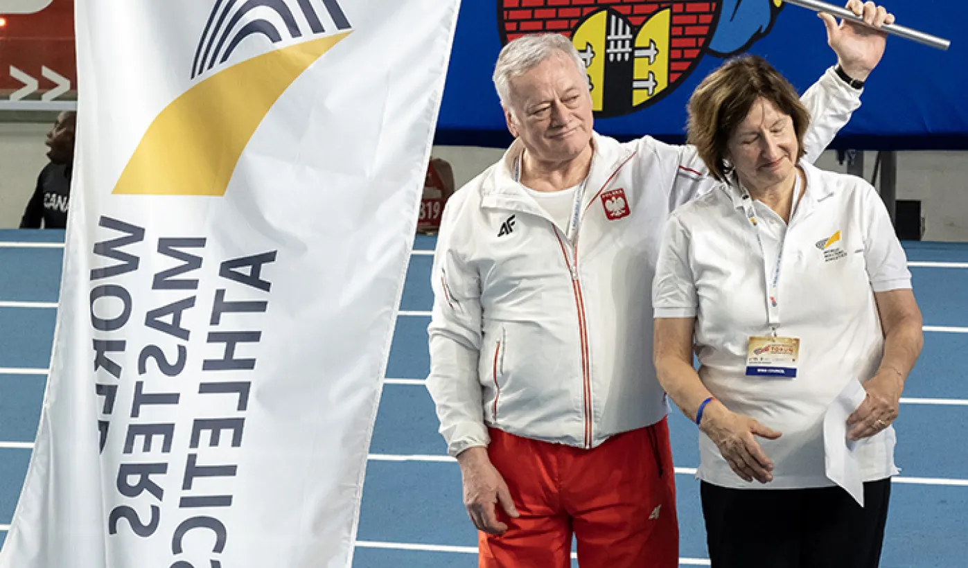 1 kwietnia 2023 r. zakończyły się 9. Halowe Mistrzostwa Świata w Lekkoatletyce Masters - Toruń 2023. Podczas ceremonii zamknięcia mistrzostw było przekazanie flagi mistrzostw organizatorom. Z rąk prezydenta Michała Zaleskiego odebrała ją Margit Jungmann, Prezydent Międzynarodowej Federacji Lekkiej Atletyki Masters. Fot. Wojtek Szabelski