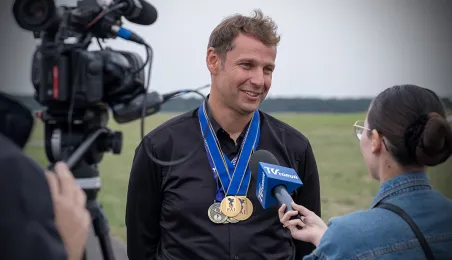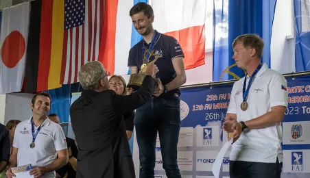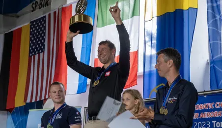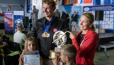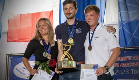 Na lotnisku Aeroklubu Toruńskiego zakończyły się 25. Mistrzostwa Świata FAI w Akrobacji Szybowcowej oraz 13. Mistrzostwa Świata FAI w Akrobacji Szybowcowej w klasie Advanced. Polacy wypadli znakomicie. Maciej Pospieszyński zdobył złoto w klasie Unlimited indywidualnie oraz drużynowo - wraz z Mirosławem Wrześniewskim i Michałem Klimaszewskiemu. Po srebro w klasie Advanced oraz drużynowo po brąz w klasie Unlimited - razem z Pawłem Mazurem i Piotrem Sieradzanem - sięgnęła Agata Porębska. Fot. Wojtek Szabelski