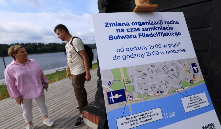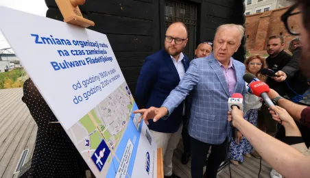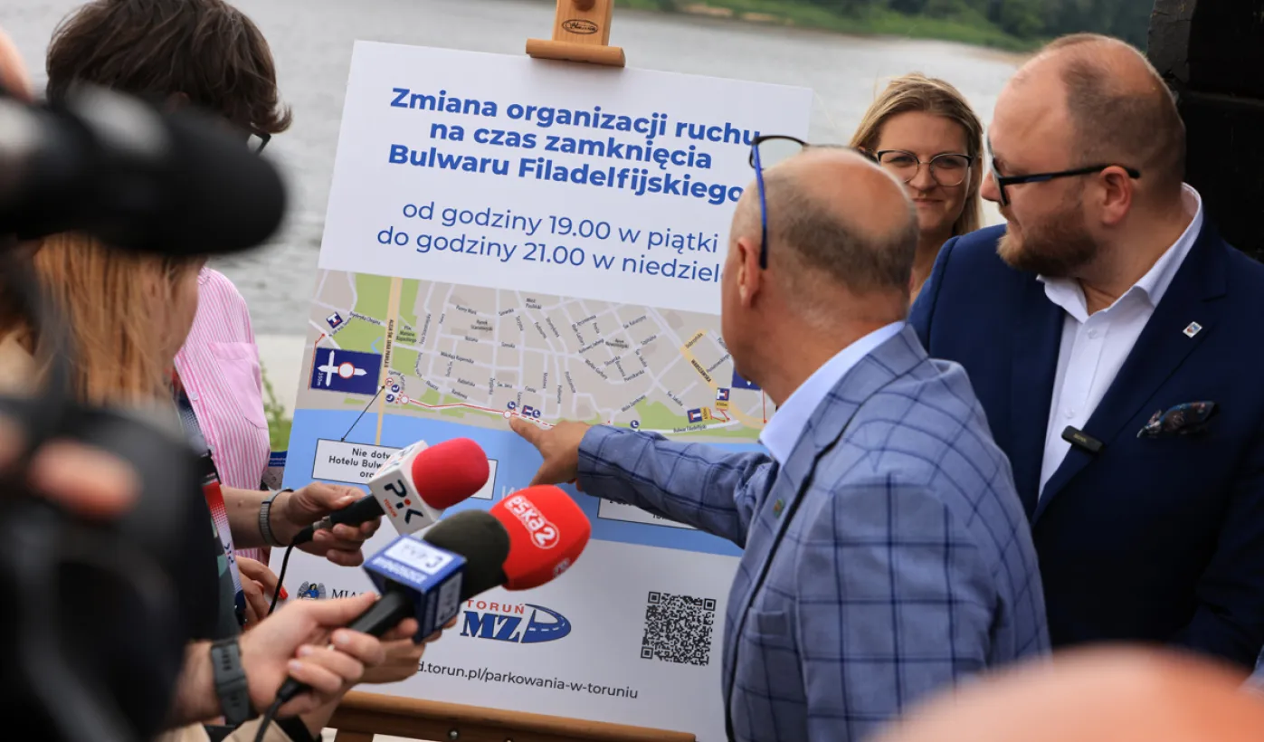 19 czerwca 2024 r. podczas briefingu prasowego prezydent Paweł Gulewski i jego zastępca Rafał Pietrucień przedstawili zmiany w organizacji ruchu na ul. Bulwar Filadelfijski, jakie będa obowiązywały latem w weekendy. Fot. Sławomir Kowalski