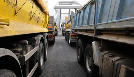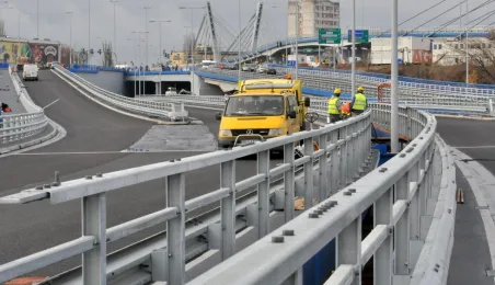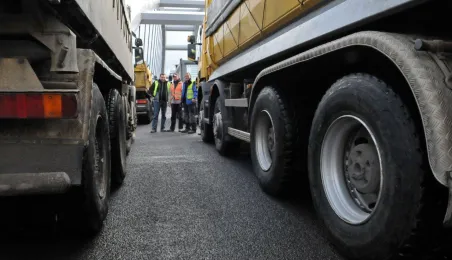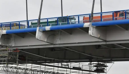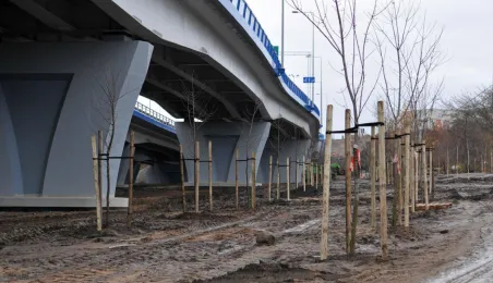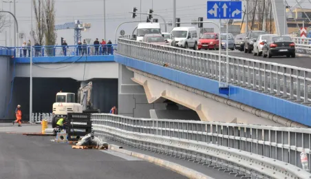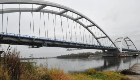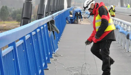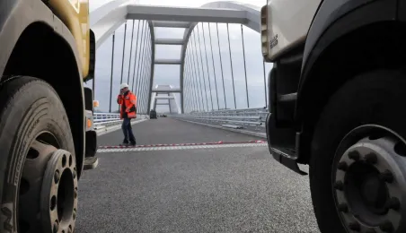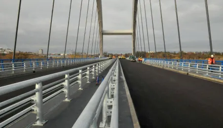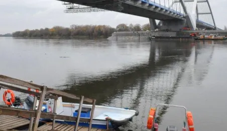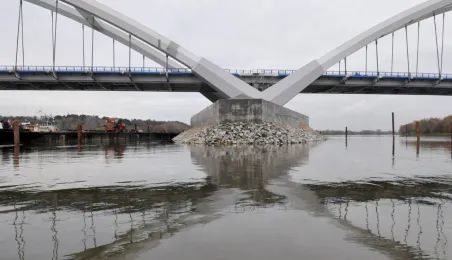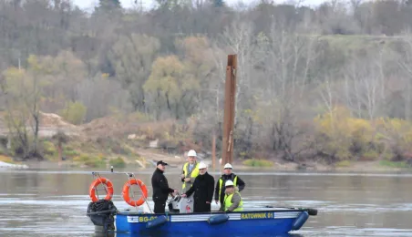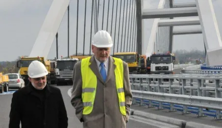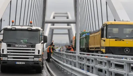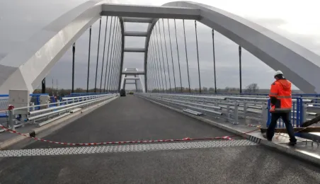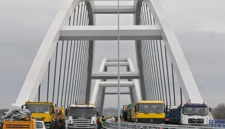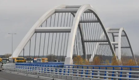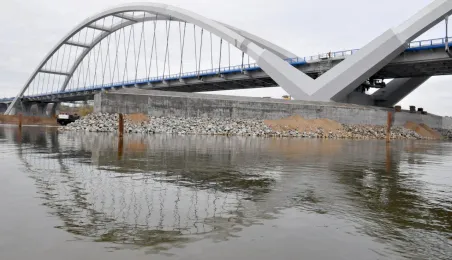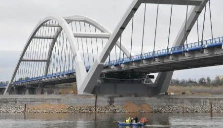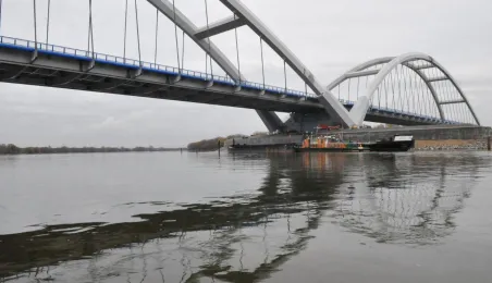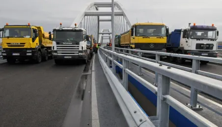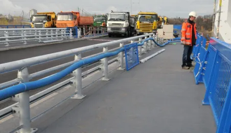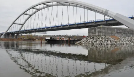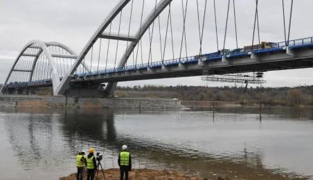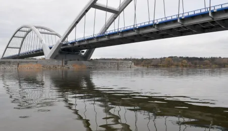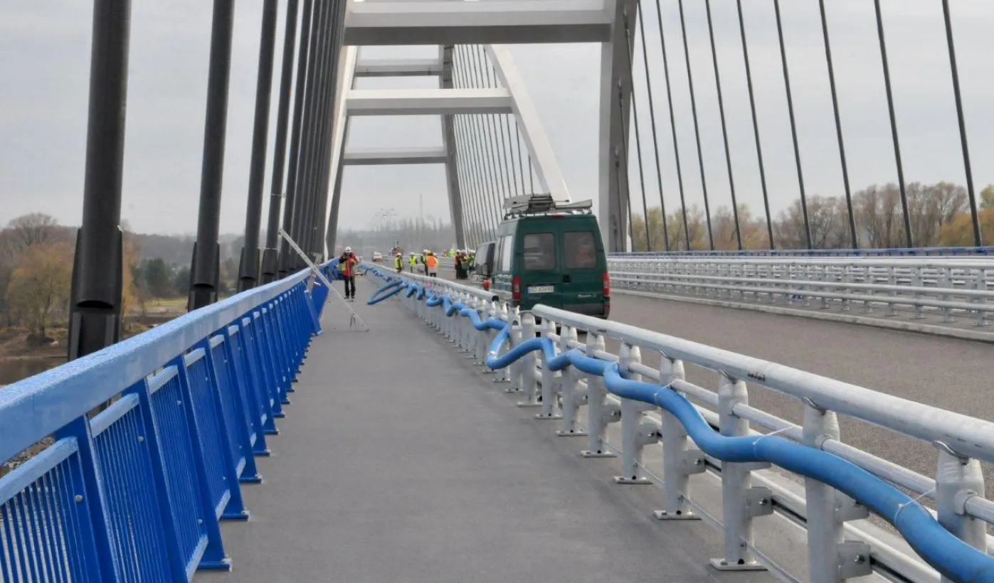 Miesiąc przed otwarciem rozpoczęły się próby obciążeniowe na nowym moście drogowym w Toruniu. Na konstrukcję wjedzie kilkanaście ciężarówek wypełnionych kruszywem, każda będzie ważyła około 33 tony. Najpierw będą stały, potem ruszą z niewielką prędkością. Próby statyczne i dynamiczne potrwają kilka dni. Zdjęcia z 8 listopada 2013 r. Fot. Małgorzata Litwin.