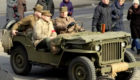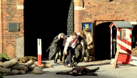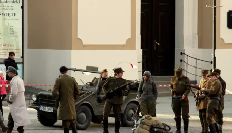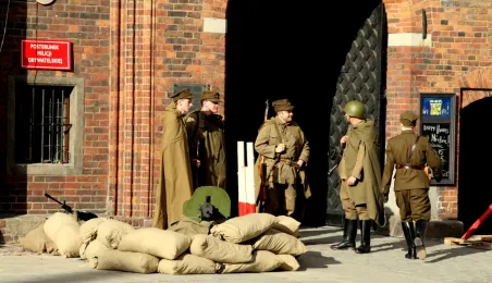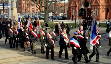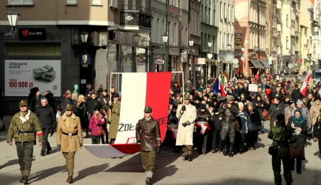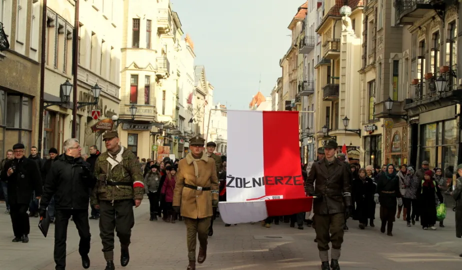 Marsz Pamięci - dla uczczenia Narodowego Dnia Pamięci Żołnierzy Wyklętych. Przemarsz z Kościoła Garnizonowego, ulicą Szeroką na Rynek Staromiejski, gdzie przed wejściem do Ratusza odbyła się inscenizacja przedstawiająca zatrzymanie dwóch żołnierzy niepodległościowych przez LWP. Po uwięzieniu ich na posterunku milicji nastąpił, zakończony sukcesem, atak żołnierzy wyklętych w celu uwolnienia współtowarzyszy. Toruń, 2 marca 2013 r. Fot.: Mateusz Trawiński.