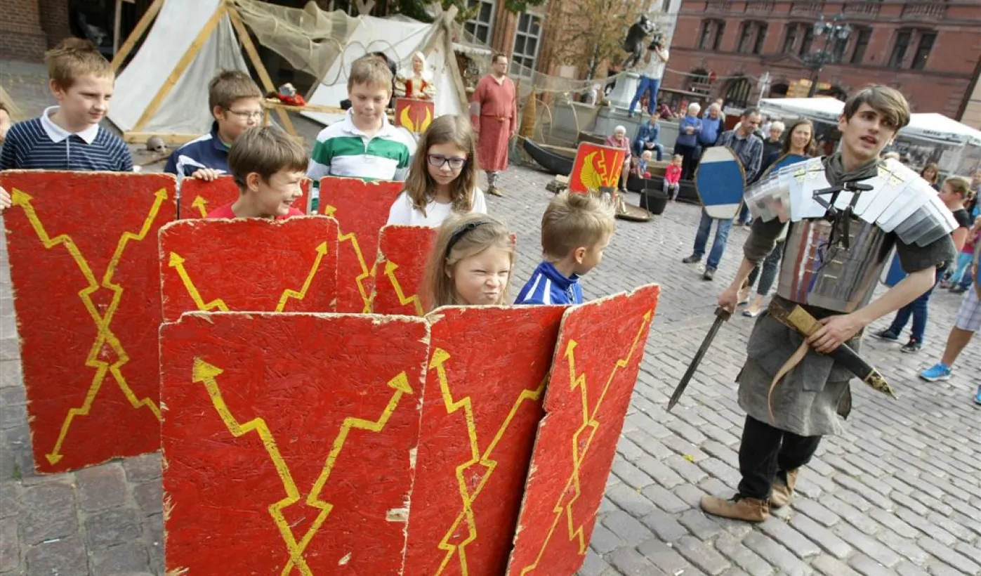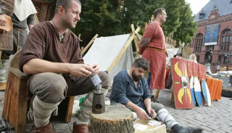 14 września 2014 r. Toruń włączył się w obchody Europejskich Dni Dziedzictwa. Pod pomnikiem Kopernika na Rynku Staromiejskim można było obejrzeć inscenizacje z wiślanej historii Torunia: czasy przepraw przez rzekę kupców podążających szlakiem bursztynowym, wyprawy wiślane Słowian i wikingów z udziałem 12-metrowej repliki łodzi Wikingów oraz scenki z życia flisaków. Fot. Adam Zakrzewski