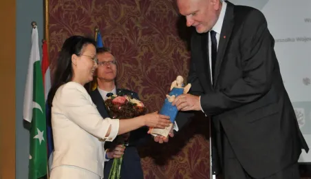 Przedstawiciele kilkunastu krajów azjatyckich i naukowcy zajmujący się problematyką dalekowschodnią gościli w Toruniu 21-22 maja 2015 r. na II Międzynarodowym Kongresie Azjatyckim. Podczas otwarcia spotkania pani Wu Guang – Radczyni ds. Kultury Chińskiej Republiki Ludowej w Polsce otrzymała dyplom honorowy Wydawnictwa Adam Marszałek za współpracę w dziedzinie wydawniczej. Fot. Małgorzata Litwin