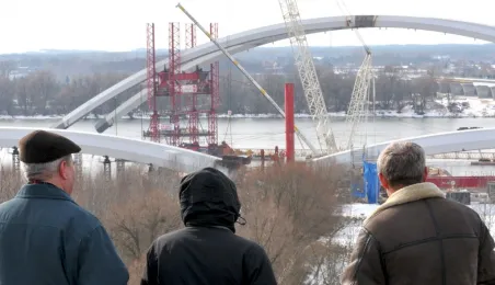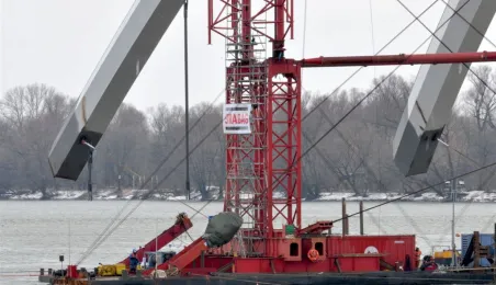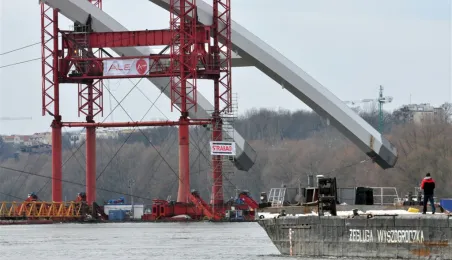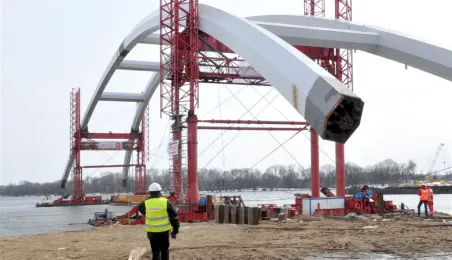 Pierwsze zdjęcia z operacji przemieszczania łuków przęsła nowego toruńskiego mostu przez Wisłę. Stalowa konstrukcja płynie na specjalnych barkach z miejsca, w którym została zmontowana - do podpór fundamentowych mostu, na których zostanie oparta. Operacja rozpoczęła się w czwartek, 28 marca 2013 r. Fot.: Małgorzata Litwin.