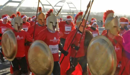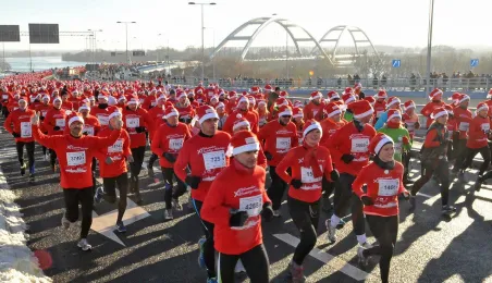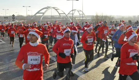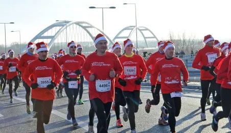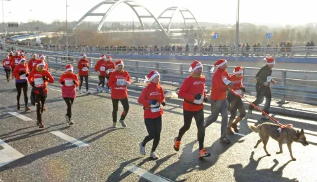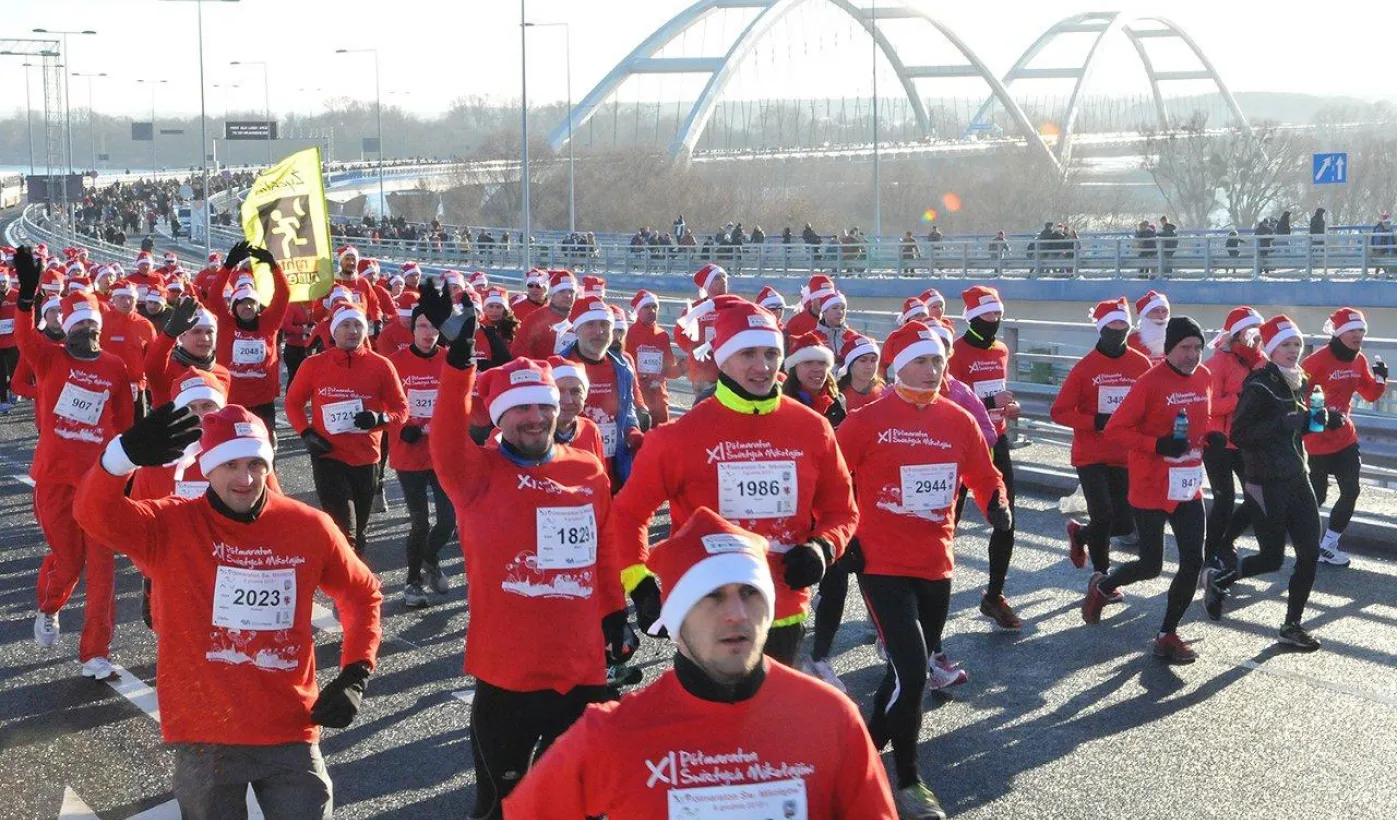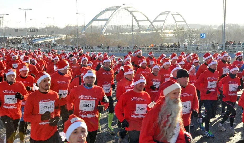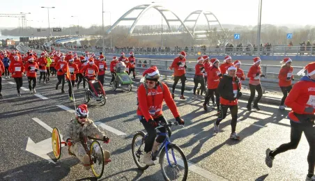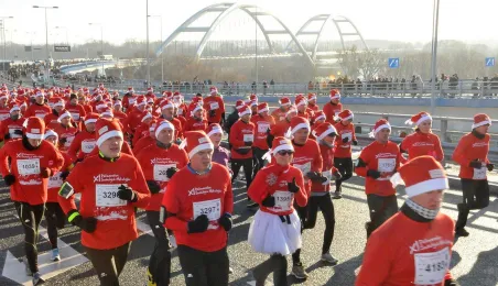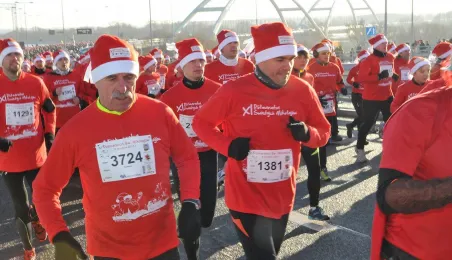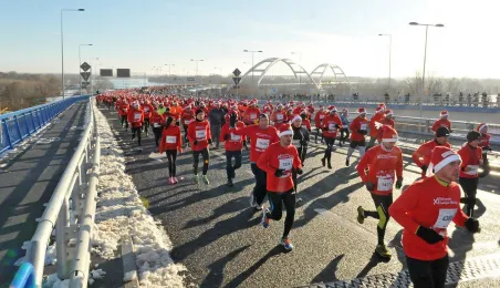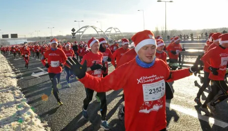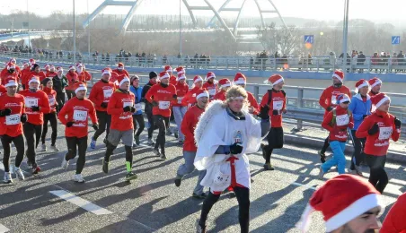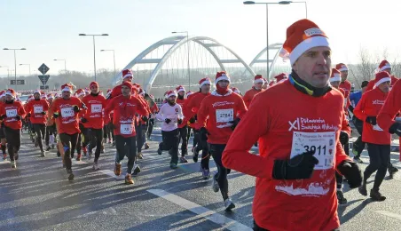 Gdzie przybywa ponad 4000 Świętych Mikołajów, tam i prezent musi być ogromny. 8 grudnia 2013 r. z nowego mostu w Toruniu wystartował tradycyjny grudniowy Półmaraton Świętych Mikołajów. W tym roku impreza odbyła się już po raz jedenasty. Mimo mroźnej pogody na starcie przeszło 21-kilometrowego biegu stanęła rekordowa liczba prawie 4 tys. uczestników. Ale i okazja była niecodzienna - Mikołaje przebiegli po nowej przeprawie, która dla kierowców zostanie otwarta 9 grudnia 2013 r. Zdjęcia: Małgorzata Litwin