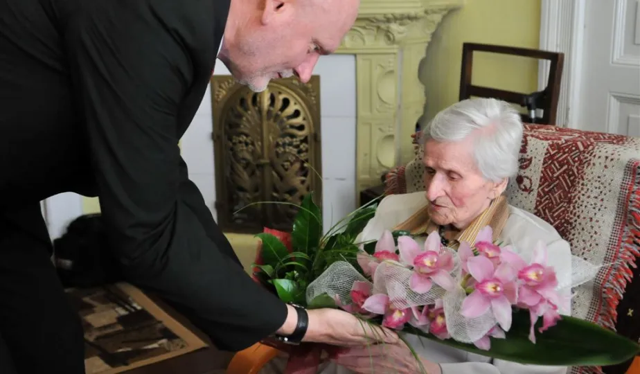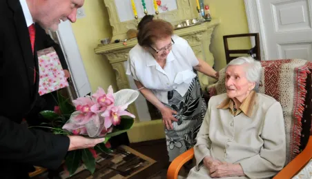 Pani Helena Klaman z ul. Rabiańskiej skończyła 18 maja 2013 roku 104 lata. Jubilatkę odwiedzili z gratulacjami prezydent Torunia Michał Zaleski i szefowa USC Katarzyna Pułkownik. Fot. Małgorzata Litwin