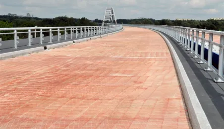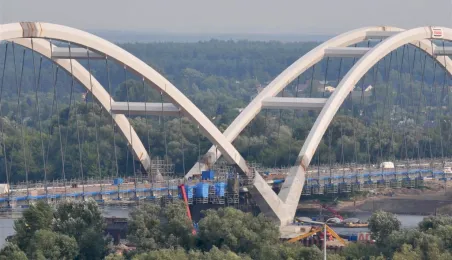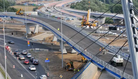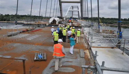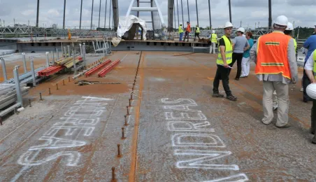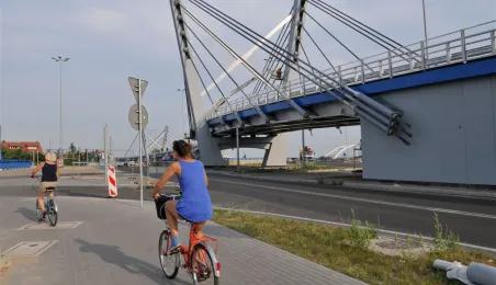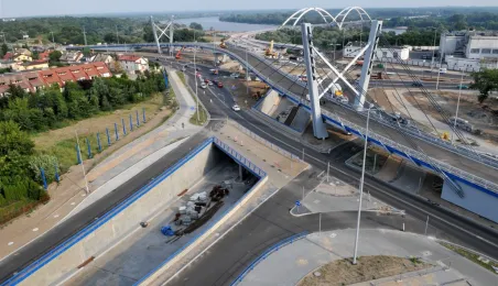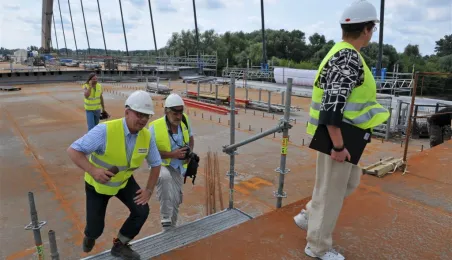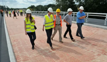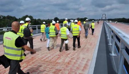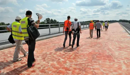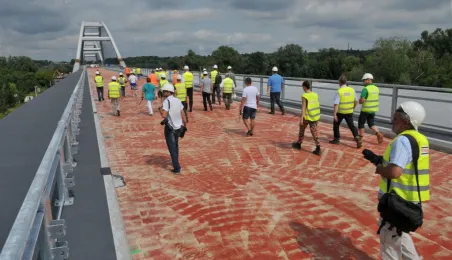 Dwa brzegi Torunia połączone! Na miejsce trafił ostatni, 19 element płyty pomostowej i można już suchą stopą przejść pod łukami mostu z prawego na lewy brzeg. 9 sierpnia 2013 r. uczynili to jako pierwsi dziennikarze lokalnych mediów w towarzystwie prezydenta Torunia Michała Zaleskiego, przedstawicieli MZD, projektanta i wykonawców inwestycji - firmy Strabag. Zdjęcia z 9 sierpnia 2013 r. Fot. Małgorzata Litwin