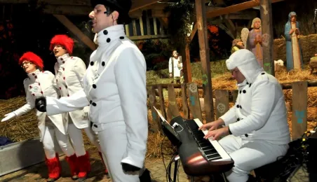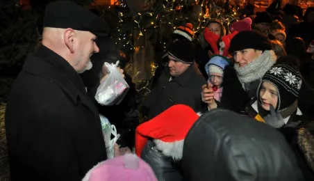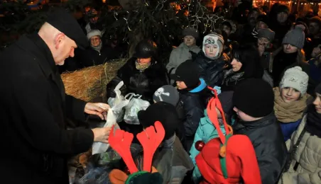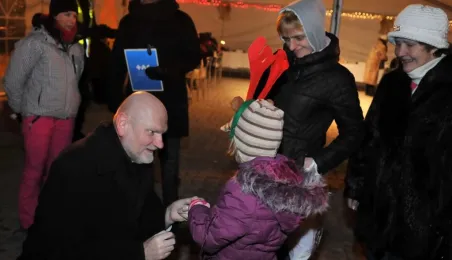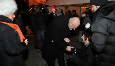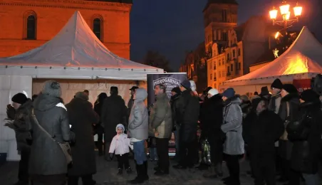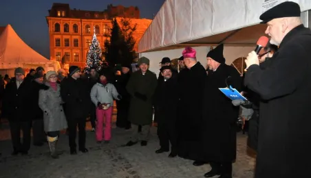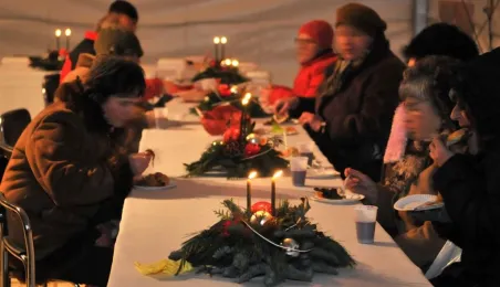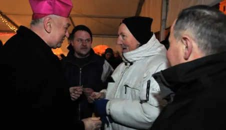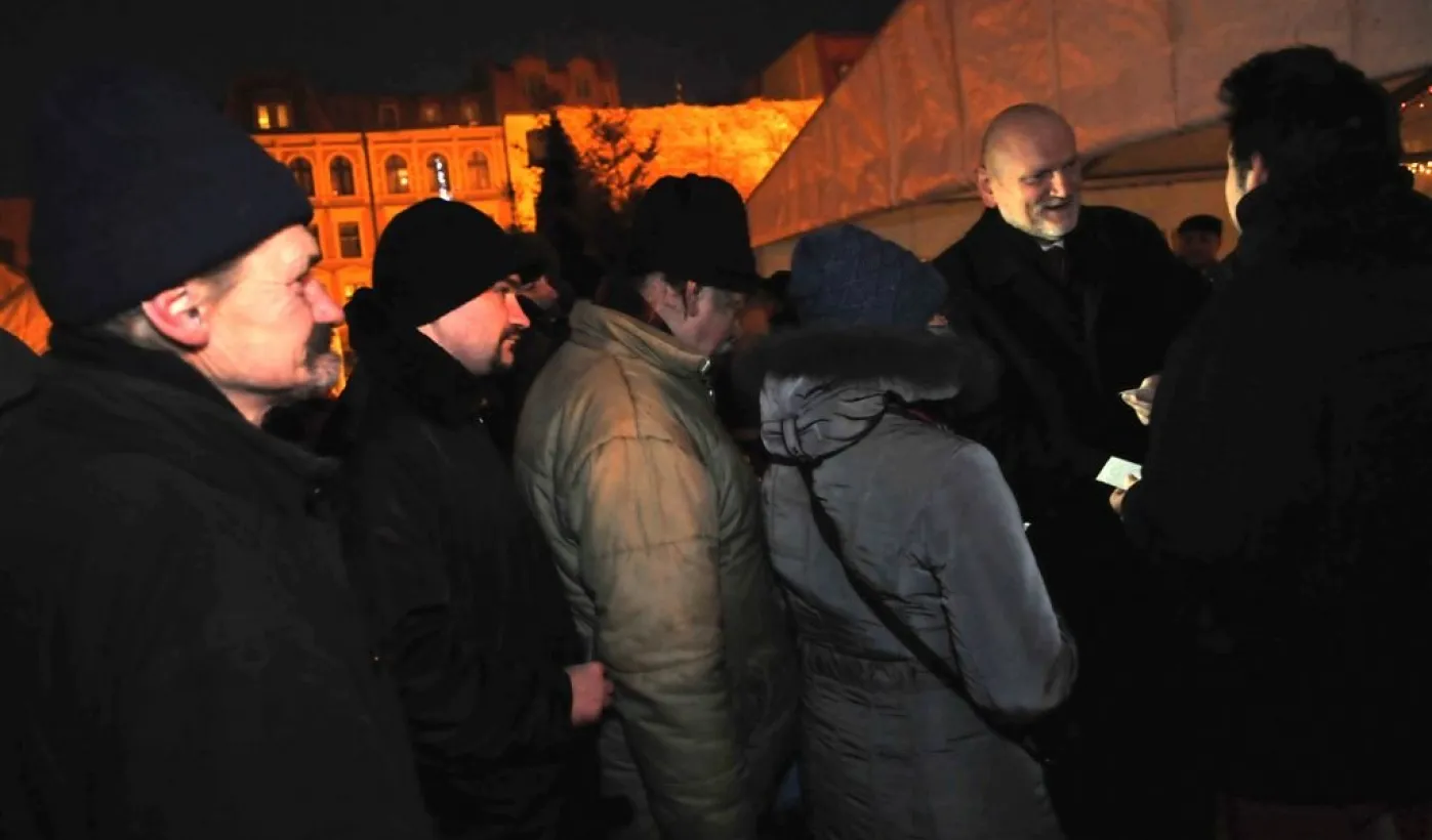 Fotografie wykonane podczas plenerowego spotkania wigilijnego dla osób potrzebujących. Wigilia, z udziałem biskupa toruńskiego Andrzeja Suskiego i prezydenta Torunia Michała Zaleskiego, odbyła się 22 grudnia 2012 r. Fot.: Małgorzata Litwin.