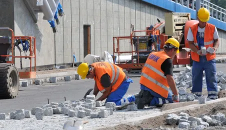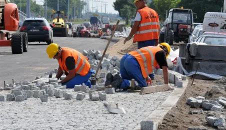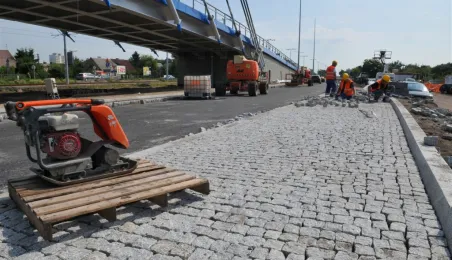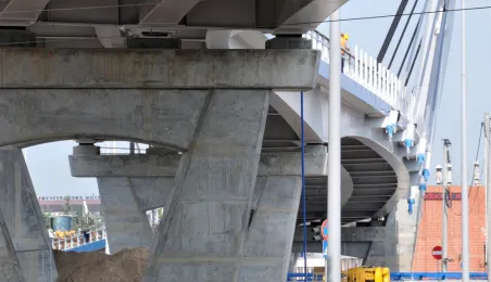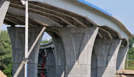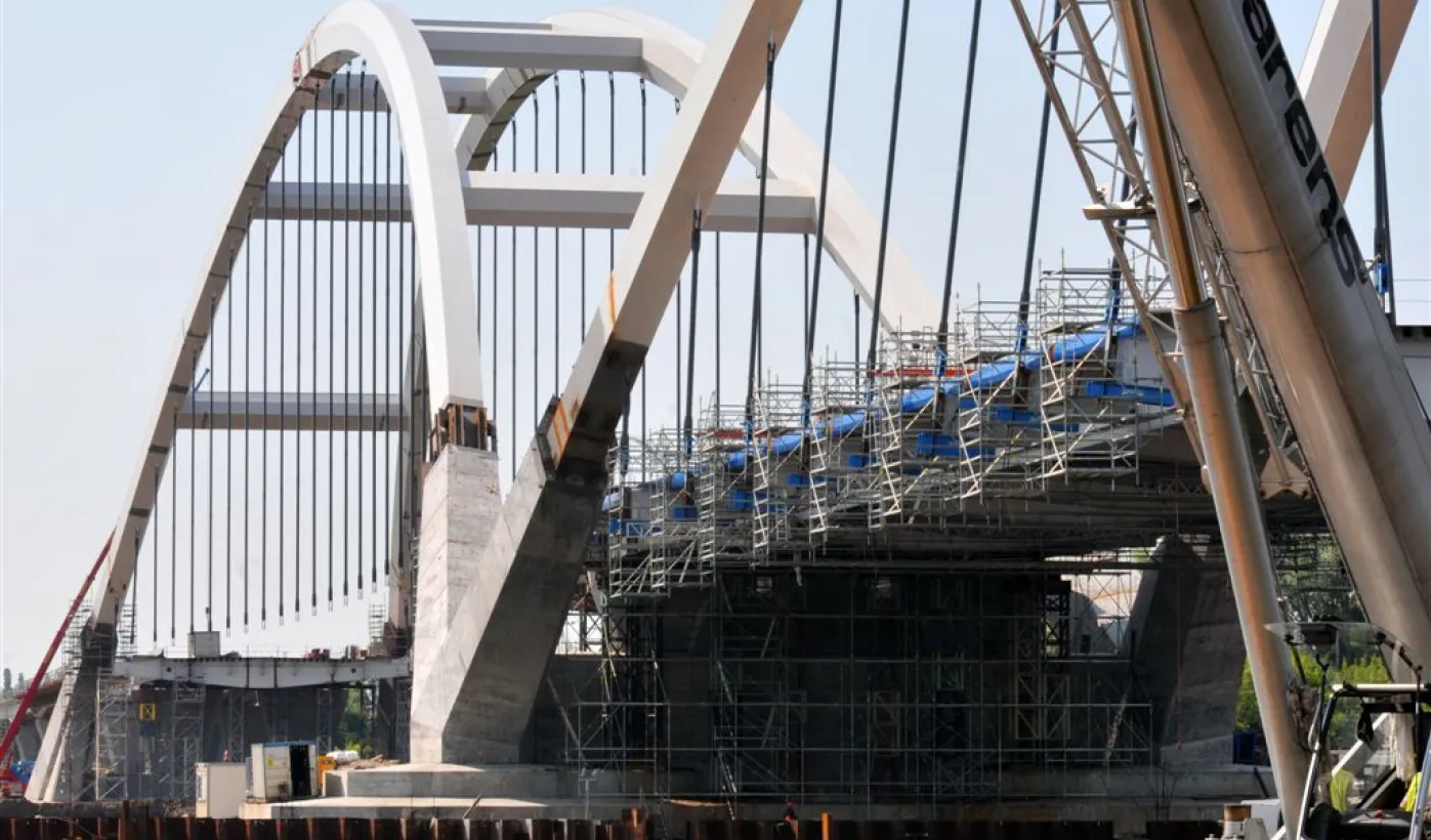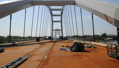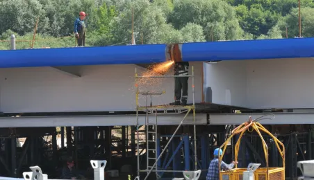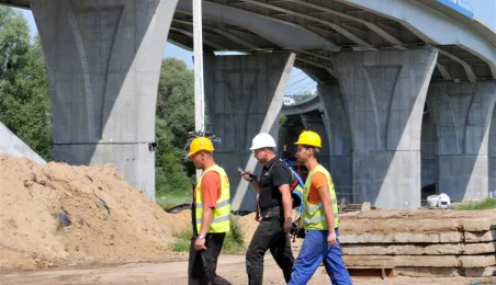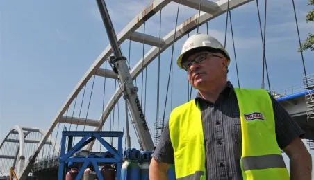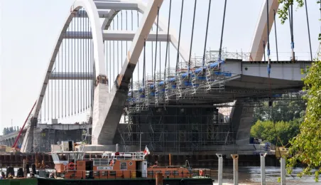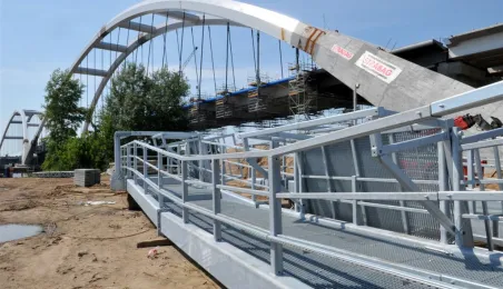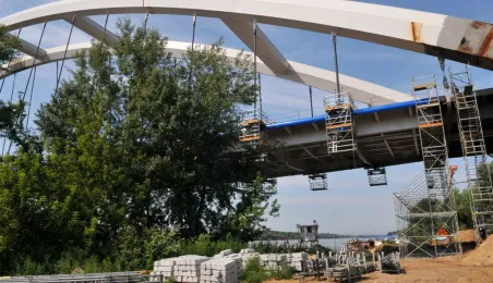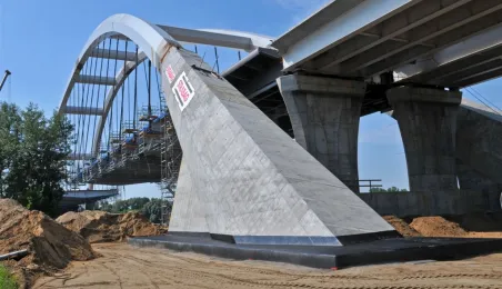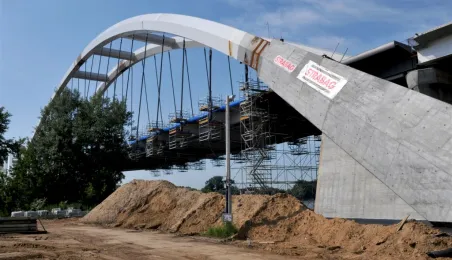 Budowa nowego mostu w Toruniu w lipcu 2013 r. Najbardziej widowiskowe prace są obecnie prowadzone pod łukami mostowymi, gdzie wykonawca podwiesza i montuje płyty pomostu. Elementy powstają w wytwórni w Płocku i drogą wodną są transportowane na plac budowy. Zdjęcia: Małgorzata Litwin (fot. 4, 6 Lech Kamiński)