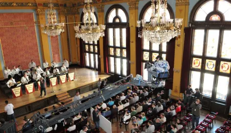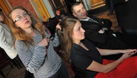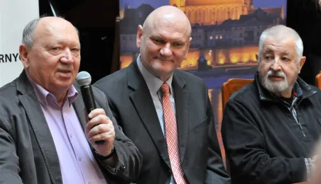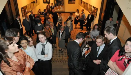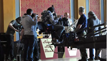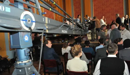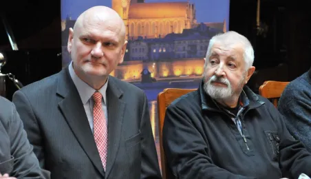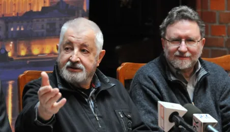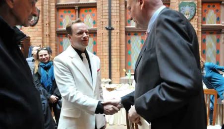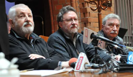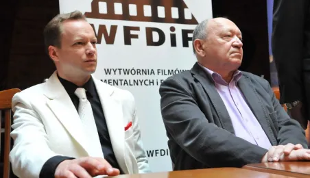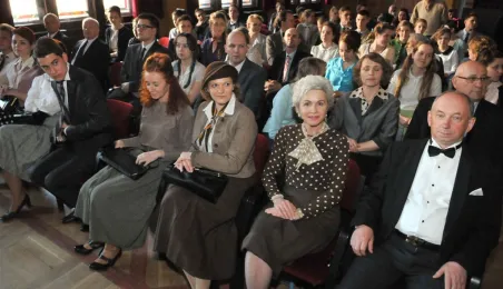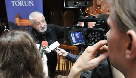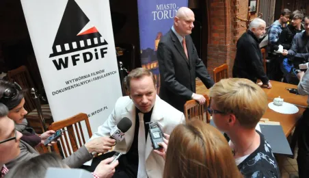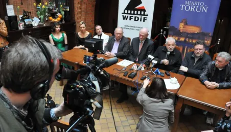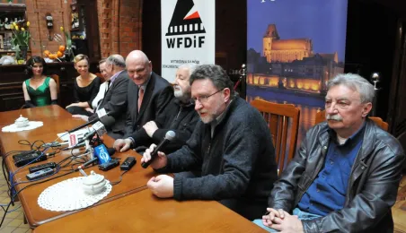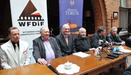 W Toruniu trwają zdjęcia do najnowszego filmu Janusza Majewskiego "Excentrycy". Akcja toczy się w latach 50. ubiegłego wieku. Główną rolę jazzmana Fabiana gra Maciej Stuhr, jego siostrę Wandę - Sonia Bohosiewicz, a ukochaną Modestę - Natalia Rybicka. W rolach drugoplanowych wystepują m.in.: Anna Dymna, Paweł Królikowski, Wojciech Pszoniak oraz Wiktor Zborowski. 22 kwietnia 2015 r. z twórcami i aktorami filmu spotkał się na konferencji prasowej w Dworze Artusa prezydent Torunia Michał Zaleski. Fot. Małgorzata Litwin