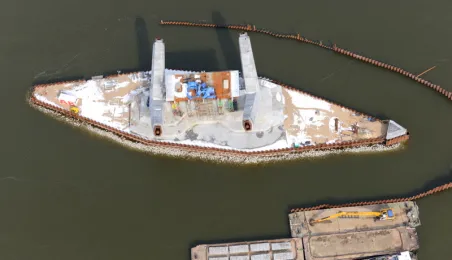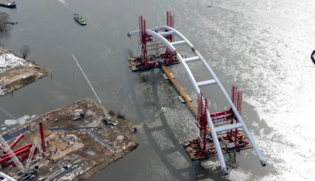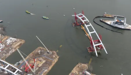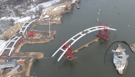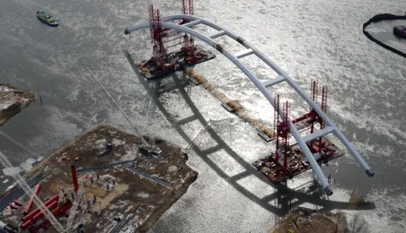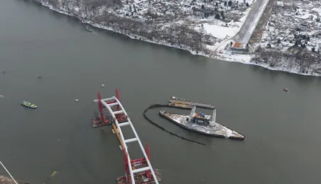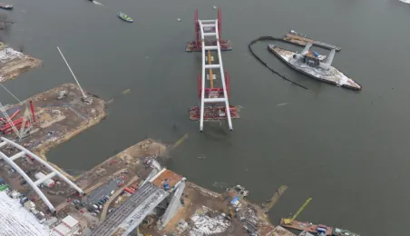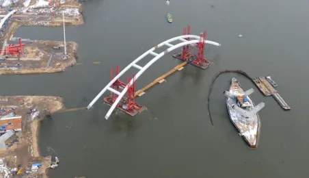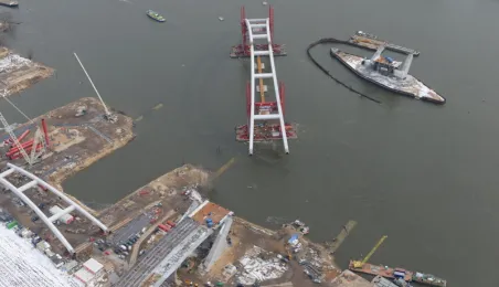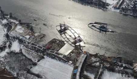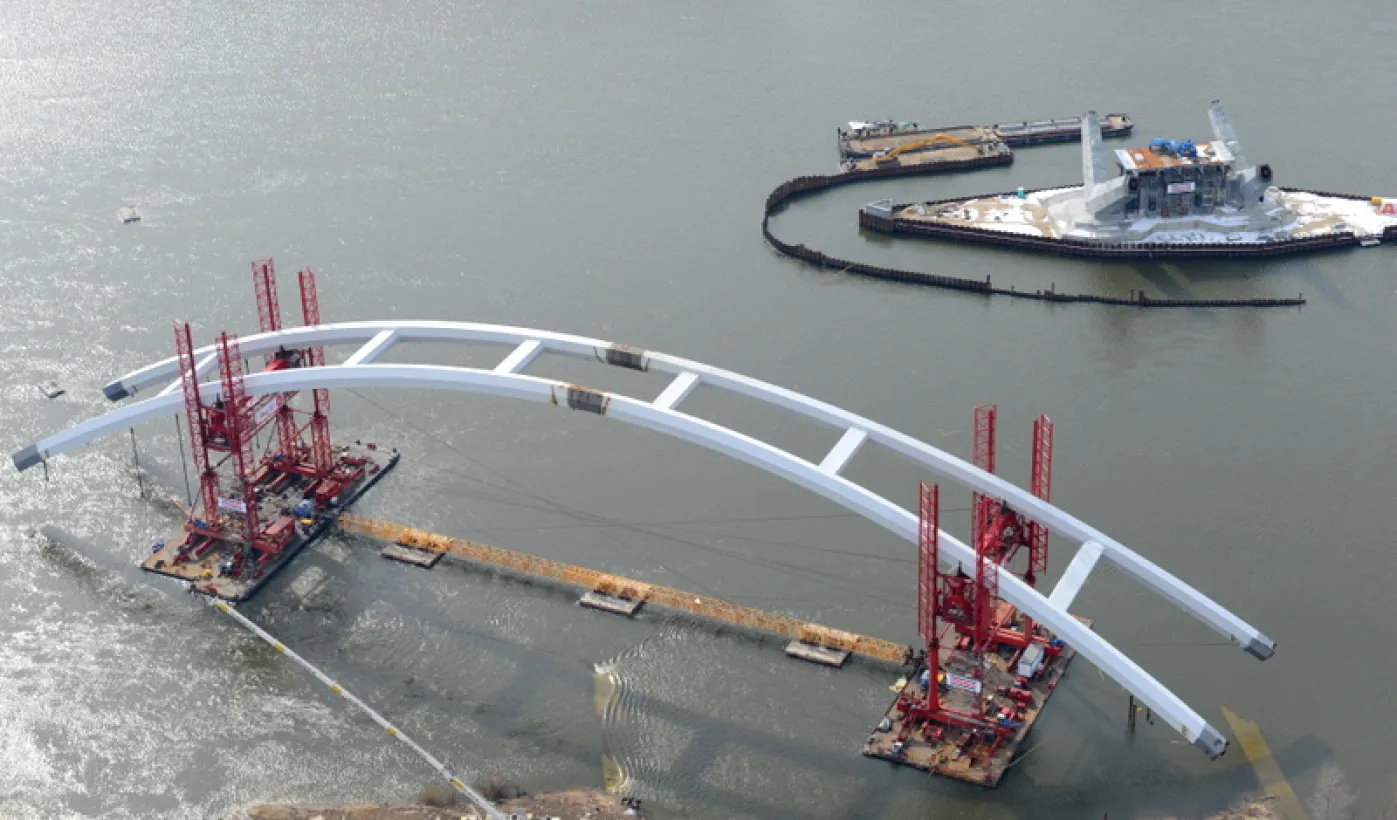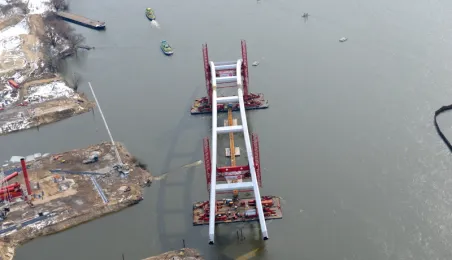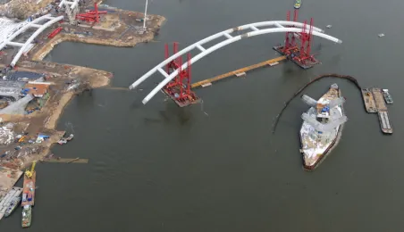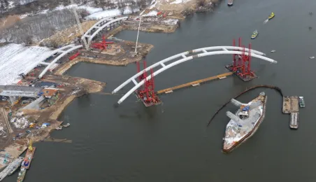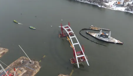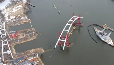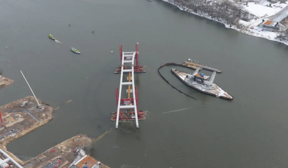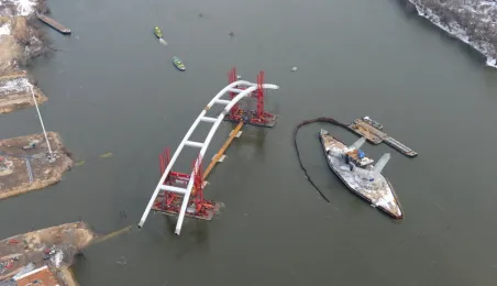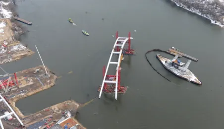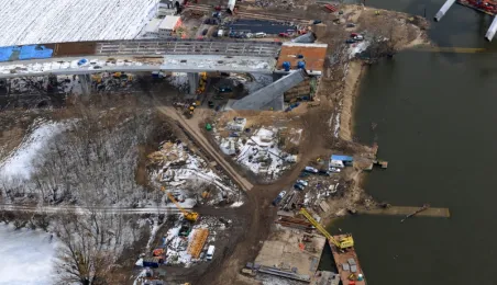 Fotografie przedstawiające transport z placu montażowego na podpory pierwszego przęsła nowego mostu przez Wisłę w Toruniu. Zdjęcia z powietrza zostały wykonane przez Grupę FALCO. Toruń, 28 marca 2013 r.