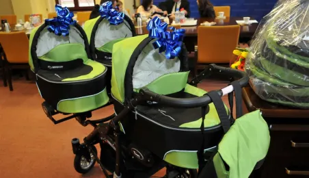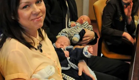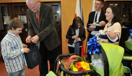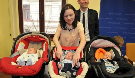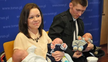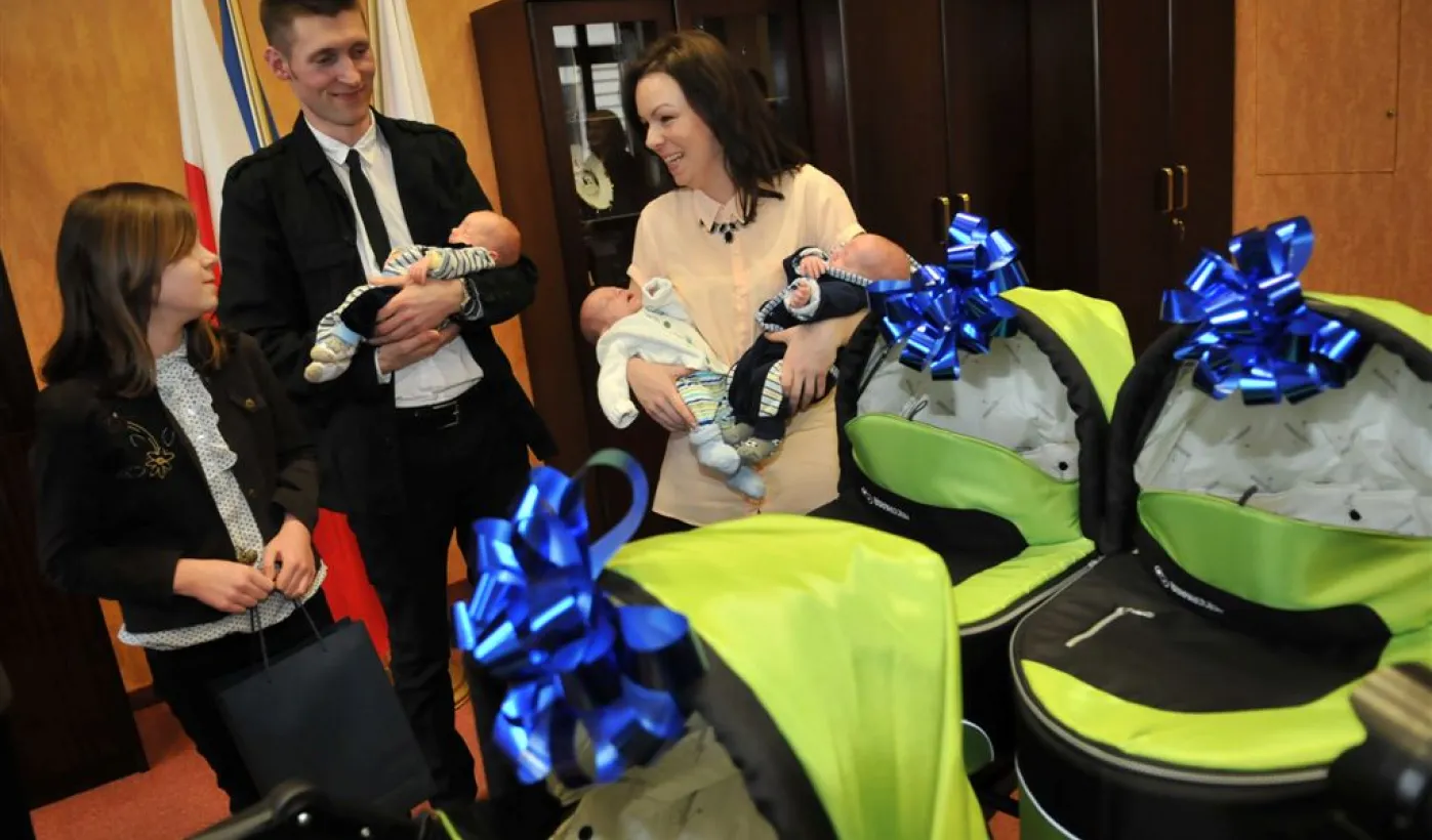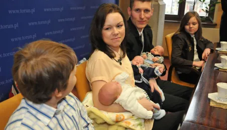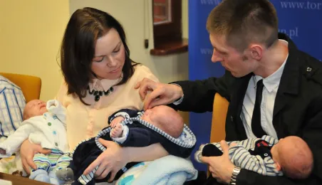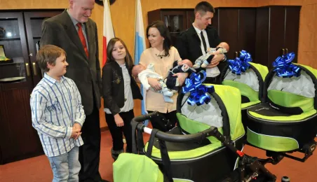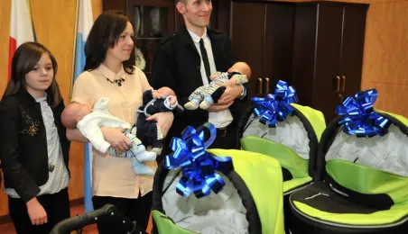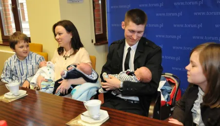 Szymon, Antek i Franek przyszli na świat 8 stycznia 2014 r. w szpitalu na Bielanach. Każdy ważył ponad dwa kilogramy. 7 lutego 2014 r. z trojaczkami, ich rodzicami i rodzeństwem spotkał się z prezydent Torunia Michał Zaleski. Podarował maluchom potrójny wózek. Fot. Małgorzata Litwin