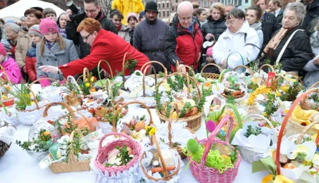 Zgodnie z wieloletnią toruńską tradycją w Wielką Sobotę, 26 marca 2016 r. na toruńskim Rynku Staromiejskim odbyło się święcenie wielkanocnych pokarmów. Poświęcenia wielkanocnych koszyczków dokonał proboszcz parafii katedralnej ks. prałat Marek Rumiński, a prezydent Torunia Michał Zaleski złoży świąteczne życzenia mieszkańcom i gościom miasta. Uroczystości towarzyszyła impreza pod hasłem "Jedz żur, a będziesz silny jak tur", podczas której odbyło się gotowanie oraz degustacja żuru przygotowanego przez Klub Integracji Społecznej przy MOPR w Toruniu. Fot. Małgorzata Litwin