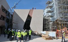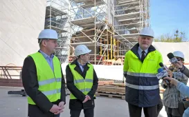 Trwa budowa wielofunkcyjnej sali koncertowej na toruńskich Jordankach. Wewnątrz montowane są podwieszane sufity i windy, na elewacjach widać coraz więcej okładziny pikado, na dachach trwają prace przy izolacji akustycznej. W toku jest też konkurs na zagospodarowanie terenów zieleni parkowej wokół obiektu. 23 kwietnia 2015 r. powstającą salę obejrzeli prezydent Torunia Michał Zaleski, marszałek województwa Piotr Całbecki i przedstawiciele lokalnych mediów. Fot. Małgorzata Litwin