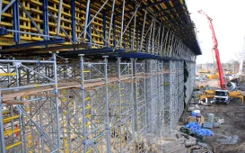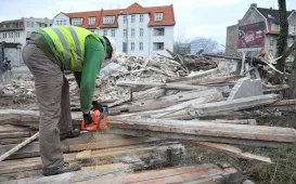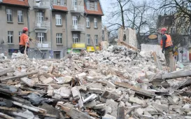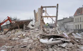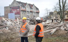 W Toruniu trwa budowa II etapu Trasy Średnicowej Północnej 3-km odcinka od ul. Grudziądzkiej do włączenia się w układ drogowy trasy mostowej w osi ul. Wschodniej. W ramach zadania budowana jest estakada, która zapewni bezkolizyjny przejazd nad ulicą Skłodowskiej-Curie, torami tramwajowymi i przebiegającymi w sąsiedztwie torami kolejowymi. Zdjęcia z 15 stycznia 2015 r. Fot. Małgorzata LitwinWyburzenia pod Trasę Staromostową