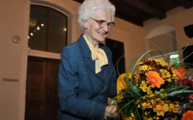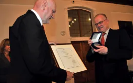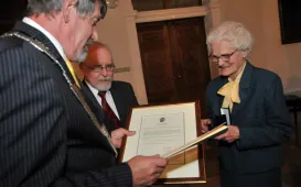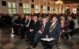 Uroczystość w Ratuszu Staromiejskim z okazji 90-lecia istnienia ToMiTo. Towarzystwo otrzymało od prezydenta Michała Zaleskiego medal Thorunium, a dr Cecylia Iwaniszewska, najstarsza i zasłużona działaczka ToMiTo - medal "Za zasługi dla Miasta Torunia" na wstędze, nadany przez Radę Miasta Torunia. 27 maja 2013 r. Zdjęcia: Małgorzata Litwin.