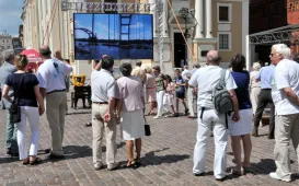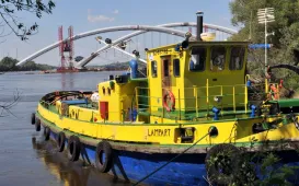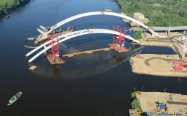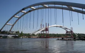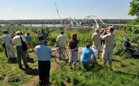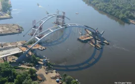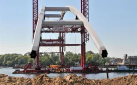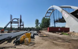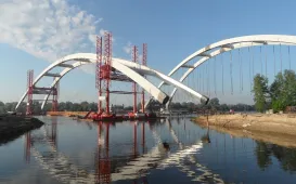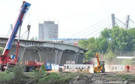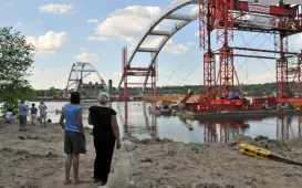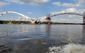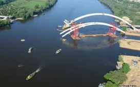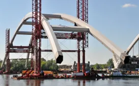 Montaż drugiego łuku nowego mostu w Toruniu. Stalowa konstrukcja o wadze 2,7 tysiąca ton płynie w kierunku podpór na barkach. Operacja rozpoczęła się w niedzielę, 19 maja 2013 r. o godz. 4.30 i potrwa kilkanaście godzin. Na wiślanych skarpach i telebimie ustawionym na Rynku Staromiejskim montaż łuku obserwują mieszkańcy Torunia. Zdjęcia z godz. 9.00-13.00. Fot. Małgorzata Litwin, Paweł Piotrowicz, Aldona Sztyma.Drugi łuk płynie do podpór