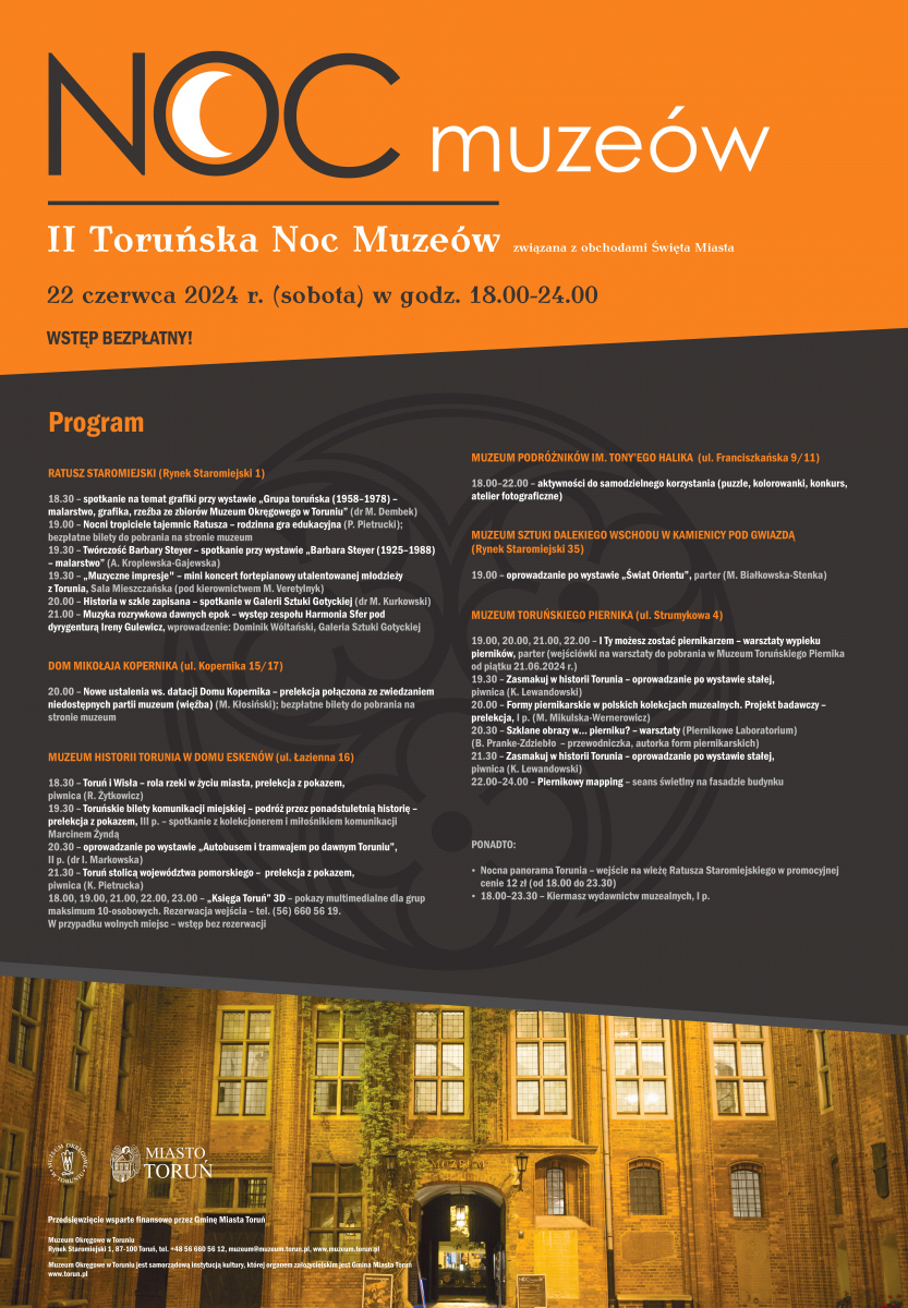 Muzeum Okręgowe w Toruniu z przyjemnością zaprasza na II Toruńską Noc Muzeów, która odbędzie się w sobotę, 22 czerwca 2024 r., od godz. 18:00 aż do północy.